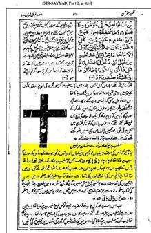 ((عند إلقاء نظرة تاريخية على هذه الحادثة – الصلب – فإنه يصبح بديهياً أن عيسى عليه السلام لم يمت على الصليب لكنه فقد وعيه فظن الناس بأنه قد مات.. و قد أنزله الناس بعد ثلاث أو أربع ساعات و بهذا فمن المؤكد بأنه كان حياً وقتها. و في الليل أخرج من القبر و ظل مختفيا بحماية حوارييه، و قد رآه الحواريون و التقوا به، و بعد ذلك لبث عمراً قبل أن يموت ميتة طبيعية((