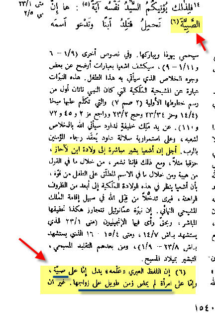 أولاً :- أتحدى أى نصرانى يُخرج لنا من كاتبه عدد دُعى فيه المسيح بـــ (عمانوئيل) . ثانياً :- هذه تلفيقه من متى ليس إلا مت 1 :22 - 23 وَهذَا كُلُّهُ كَانَ لِكَيْ يَتِمَّ مَا قِيلَ مِنَ الرَّبِّ بِالنَّبِيِّ الْقَائِلِ:«هُوَذَا الْعَذْرَاءُ تَحْبَلُ وَتَلِدُ ابْنًا، وَيَدْعُونَ اسْمَهُ عِمَّانُوئِيلَ» الَّذِي تَفْسِيرُهُ: اَللهُ مَعَنَا. إذاً نعود لنرى النبى القائل ماذا قال :- و حدث في ايام احاز بن يوثام بن عزيا ملك يهوذا ان رصين ملك ارام صعد مع فقح بن رمليا ملك اسرائيل الى اورشليم لمحاربتها فلم يقدر ان يحاربها و اخبر بيت داود و قيل له قد حلت ارام في افرايم فرجف قلبه و قلوب شعبه كرجفان شجر الوعر قدام الريح فقال الرب لاشعياء اخرج لملاقاة احاز انت و شارياشوب ابنك الى طرف قناة البركة العليا الى سكة حقل القصار و قل له احترز و اهدا لا تخف و لا يضعف قلبك من اجل ذنبي هاتين الشعلتين المدخنتين بحمو غضب رصين و ارام و ابن رمليا لان ارام تامرت عليك بشر مع افرايم و ابن رمليا قائلة نصعد على يهوذا و نقوضها و نستفتحها لانفسنا و نملك في وسطها ملكا ابن طبئيل هكذا يقول السيد الرب لا تقوم لا تكون لان راس ارام دمشق و راس دمشق رصين و في مدة خمس و ستين سنة ينكسر افرايم حتى لا يكون شعبا و راس افرايم السامرة و راس السامرة ابن رمليا ان لم تؤمنوا فلا تامنوا ثم عاد الرب فكلم احاز قائلا اطلب لنفسك اية من الرب الهك عمق طلبك او رفعه الى فوق فقال احاز لا اطلب و لا اجرب الرب فقال اسمعوا يا بيت داود هل هو قليل عليكم ان تضجروا الناس حتى تضجروا الهي ايضا و لكن يعطيكم السيد نفسه اية ها العذراء تحبل و تلد ابنا و تدعو اسمه عمانوئيل (إش 7 : 1 - 14) هنا نلاحظ أن قلب آحاز ملك يهوذا ارتجف لأن دولتي إسرائيل وسوريا (ارام) تآمرتا عليه وعلى دولته ، وكان الرب الإله مع آحاز ، وأمر الربُ إشعياءَ أن يذهب هو وابنه شَآرَ يَاشُوبَ ويُطَمْئِن آحاز ملك يهوذا ، ووعده الرب أنه في مدة لا تزيد عن 65 سنة تكون حلت الهزيمة بدولتي إسرائيل وسوريا (ارام) ، وقد أعطاه الله علامة على اقتراب تحقق النصر، وهي أن تحبل سيدة منهم بولد فتسميه "عمانوئيل" . فهل المدة بين إشعياء و المسيح 65 سنة ؟! أم أن متى لم يستطع فبركة النبوءة و تفصيلها على مقاس المسيح ؟! و تعترف الترجمة اليسوعية : " أن إشعياء يشير مباشرة إلى ولادة ابن لآحاز ":p015: غير أنهم عادوا ليُهموا القارىء أن النبوءة عن المسيح معتمدين على اسم عمانوئيل مدعين أن له هيبة و قوة ، و سوف نرى بأنفسنا اسم أكثر قوة من اسم عمانوئيل - بحسب فكرهم فى اسم عمانوئيل - فى نهاية الرد . كما إعترفوا أن الكلمة العبرانية فى الأصل العبرى : " يدل إما على صبية أو على إمرأة لم يمض زمن طويل على زواجها ":p015:و ليس على عذراء . كما أن العذراء كانت مخطوبة ، حين حملت بالمسيح - عليه السلام - و لم تكن متزوجة و لم يمض على زواجها زمن طويل . مت 1 : 18 أَمَّا وِلاَدَةُ يَسُوعَ الْمَسِيحِ فَكَانَتْ هكَذَا: لَمَّا كَانَتْ مَرْيَمُ أُمُّهُ مَخْطُوبَةً لِيُوسُفَ، قَبْلَ أَنْ يَجْتَمِعَا، وُجِدَتْ حُبْلَى مِنَ الرُّوحِ الْقُدُسِ http://www.kalemasawaa.com/vb/attach...1&d=1311338887 غير أنهم أشاروا إلى أن الترجمة السبعينية (اليونانية للعهد القديم) قد إستخدمت كلمة عذراء ، و هذا لا يهمنا فالأصل العبرى للعهد القديم هو المعول عليه دائماً ، و ليس الترجمات .[ص:1540] http://www.kalemasawaa.com/vb/attach...1&d=1311627291 كما قال القس منيس عبد النور فى (شبهات وهمية) :- [ص:93] http://www.kalemasawaa.com/vb/attach...1&d=1311336869 [ص:161] http://www.kalemasawaa.com/vb/attach...1&d=1311340528 [كتاب الأصول] لابن جناح اليهودى http://www.kalemasawaa.com/vb/attach...1&d=1311800907 [ عمود : 529 ] http://www.kalemasawaa.com/vb/attach...1&d=1311800907 الرجل يؤكد أن الكلمة تأتى بمعنى بكر أو غير بكر ، و إستشهد على ذلك بأسفار آخرى (سفر الأمثال) فالكلمة لا تدل على عذراء كما يدعى النصارى ، بل إن الرجل كان يُحاجج النصارى بذلك و يرفض ترجمة النصارى للكلمة بالبكر (عذراء) . ثالثاً :- هل (الله معنا) تُعنى أنه (الله) ؟! فهناك (طوبيا) و التى تُعنى (الله طيب) ، فهل هذ