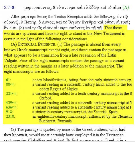 تعالى بقى نشوف موضوع الاباء دة ... يقول بروس متزجر ...(1) The passage is quoted by none of the Greek Fathers, who, had they known it, would most certainly have employed it in the Trinitarian لا يوجد اى اب من اباء الكنيسة اليونانيين أقتبس العدد ... ويؤكد كلامة يوهان ديفيد (2) ويؤكد هذا ايضا ليونارد (3) الاضافة ايضا ... الى كلام البرت بانز .. الذى لم تقرأة ..!!! (4) ان الفاصلة لم تُقتبس ابدااا من الاباء اليونانيين أثناء الخلافات حول عقيدة الثالوث .. وهذا النقطة مهمة جداا ...فلا يمكن ......اهمالها لو كانت الفقرة قانونية ( صحيحة ) III. It is never quoted by the Greek fathers in their controversies on the doctrine of the Trinity - a passage which would be so much in point, and which could not have failed to be quoted if it were genuine اذا يا عزيزى الاباء لم يقتبسوها ..... والا فلدى سؤال واحد يحسم هذا الموضوع ... وهو ليس سؤالى بالطبع ... بل أقول ما قالة علمائكم ... مَن مِن اباء الكنيسة اقتبس هذا العدد .. أثناء الحوار مع اريوس يا عزيزى ....؟؟ من استخدم هذا العدد لأثبات التثليث فى الكتاب المُقدس ؟؟ يُتبع ... Textual Commentary on the Greek New Testament (1) Introduction to the New Testament, Volume 4- By Johann David Michaelis, Herbert Marsh (2 Literary and theological review, Volume - edited by Leonard Woods, Charles D. Pigeon (3 Barnes' Notes (4 |
