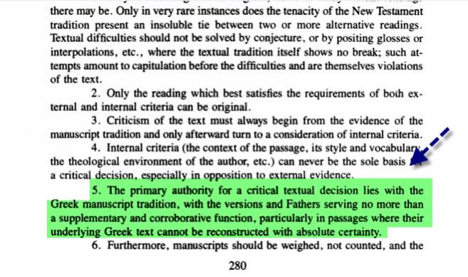 ودى كارثة بكل المقاييس بالطبع ..!!! ... واسف فى الكلمة ..الدكتور بيهزر معانا .. بس هزار تقيل شوية ..... يا عزيزى الفاضل ... الترجمات والاستشهادات الابائية .... ليس لها اى قيمة ... طلاما النص غير موجود فى النص اليونانى ... اتفضل يا استاذ متع عينك ... يقول كارت الاند ..... (1) http://www.kalemasawaa.com/vb/attach...1&d=1273690279 http://www.kalemasawaa.com/vb/attach...1&d=1273690209 The primary authority for a critical textual decision lies with the Greek Manuscripts tradition, with the versions and Fathers serving no more than a supplementary and corroborative function. السلطة الأعلى لتحديد القراءة الأصلية ...هى تقليد المخطوطات اليونانية ... والترجمات وكتابات الاباء لا تعتبر الإ عامل مٌويد وتكمليى ....!!! اتفضل يا استاذ متع عينك ... يقول جارى لا مور (2) أثناء الأختيار من القراءات المختلفة ...أغلب العلماء يتبعون التقليد .. ويبدءون بالمخطوطات اليونانية .... ثم ... يؤيدوا شهادتهم بالترجمات وكلام الاباء ... تعالى يا استاذ نشوف منيس عبد النور شخصيا بيقول اية ..!! (3) المعوَّل عليه دائماً هو الأصل العبري، أما الترجمات فيجب أن تتبع الأصل المعوَّل عليه دائماً هو الأصل العبري، أما الترجمات فيجب أن تتبع الأصل المعوَّل عليه دائماً هو الأصل العبري، أما الترجمات فيجب أن تتبع الأصل اتفضل يا استاذ متع عينك .... The primary authority for a critical textual decision lies with the Greek manuscript tradition, with the version and Fathers serving no more than a supplementary and corroborative function, particularly in passages where their underlying Greek text cannot be reconstructed with absolute certainty. http://www.jkdoyle.com/index.php/Blog/Luke-2214-20-Shorter-or-Longer-Text.html http://www.cob-net.org/compare_greektext.htm http://www.revelationreader.com/index.php/from-text-to-translation http://www.theopedia.com/New_Testament_Textual_Criticism http://www.earlham.edu/~seidti/iam/text_crit.html اذا يا عزيزى ... غياب النص عن المخطوطات اليونانية... بيطل النص .. بغض النظر عن وجودة فى مكان اخر ...!! هل النص موجود فى المخطوطات اليونانية ... ؟؟ الاجابة لا يوجد وقد تم سرد الأدلة التى تدل على ذلك ... والتى لم تنظر فيها اساسا ....... يقول بروس متزجر ... (4) ان هذة الأضافة مزيفة ... وليس لها اى حق فى وجودها فى العهد الجديد .... وتغيب عن كل مخطوطات العهد الجديد .. الا 8 مخطوطات .. أقدمهم يعود للقرن السادس عشر ..!! http://www.kalemasawaa.com/vb/attach...3&d=1288209289 وفى دائرة المعارف الكتابية ... حيث أن هذه العبارة لا توجد في أي مخطوطة يونانية ترجع إلى ما قبل القرن الخامس عشر حيث أن هذه العبارة لا توجد في أي مخطوطة يونانية ترجع إلى ما قبل القرن الخامس عشر حيث أن هذه العبارة لا توجد في أي مخطوطة يونانية ترجع إلى ما قبل القرن الخامس عشر يُتبع ..!! 1- The Text of The New Testament – Pg280 2- While Latinos Slept- By Gary E. Lamore- pg 88 3- شبهات وهمية ... 4- Textual Commentary on the Greek New Testament |