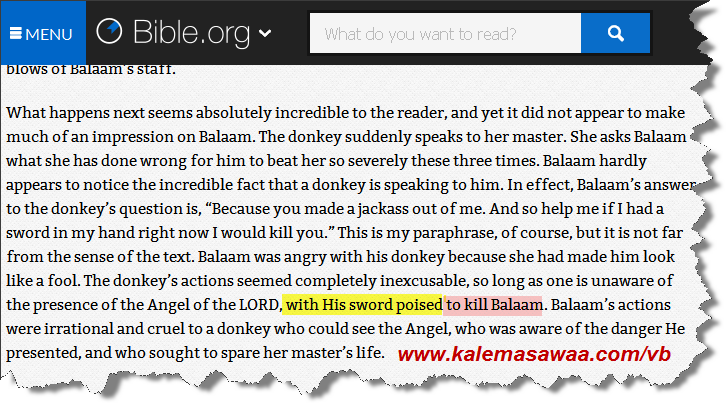 " وفي الطريق لاقاه السيد المسيح في ظهور من ظهوراته السابقة للتجسد وشرع في أن يقتله ثلاث مرات وأنقذه الحمار.. " إذن إلهك كما تدعي شرع أن يقتل ( بلعام ) ثلاث مرات و أنقذه الحمار إذن السيف كان أداة للقتل فالغضب يمكن أن يظهر بأي صورة إخرى بدون سيف لاحظ هناك إرتباط وثيق بين السيف المسلول و الشروع فى القتل الذى باء بالفشل نظراً لتدخل الحمار فى إنقاذ بلعام اقتباس: