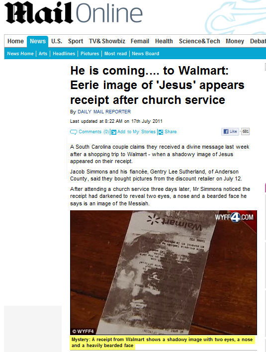 طبقًا للديلي ميل فإن أحدث ظهور ليسوع النصارى كان على فاتورة وولمارت في ساوث كارولينا حدث ذلك في الفاتورة بعد 3 أيام من حضور أصحابها للخدمة في الكنيسة http://www.kalemasawaa.com/vb/attach...1&d=1311369783 http://www.dailymail.co.uk/news/arti...=feeds-newsxml و http://www.foxnews.com/us/2011/07/19...lmart-receipt/ ___________________________________ ظهورات حديثة أخرى نشرتها صحيفة الجارديان بالأمس في مقلاة http://static.guim.co.uk/sys-images/...st-in--007.jpg على بيتزا http://static.guim.co.uk/sys-images/...za-Bri-006.jpg في فنجان قهوة http://static.guim.co.uk/sys-images/...-coffe-001.jpg على قطعة بطاطس http://static.guim.co.uk/sys-images/...-potat-004.jpg على بعض المخبوزات http://static.guim.co.uk/sys-images/...-torti-003.jpg على توست http://static.guim.co.uk/sys-images/...-toast-002.jpg لا تعليق http://static.guim.co.uk/sys-images/...s-Toas-001.jpg http://www.guardian.co.uk/world/gall...ngs?CMP=twt_fd |