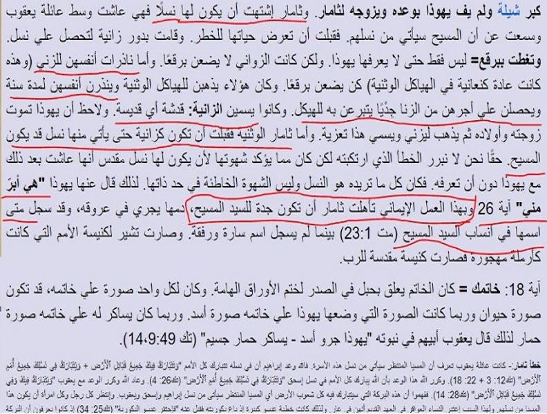 المصيبة الكبري عند المسيحيين أنهم يثقون في القساوسة ثقة عمياء .. لدرجة أن المسيحي عندما يجلس علي كرسي الاعتراف و يعترف للبابا يكون علي يقين أن " ما تحلونه في الارض أحله في السماء " .. يعني لو البابا غفر ذنوبك يبقي يسوع غفر ذنوبك .. هل القساوسة أناس فضلاء و يستحقون هذه الثقة ؟ تعالوا نري كيف يخبرنا بابا أنطونيوس فكري أن " الزنا هو عمل إيماني " .. علي هذا الرابط http://www.***************/commentaries/father_antonios/Genesis/38 .......................... أية رقم 3 في الاصحاح الأول من أنجيل متي تذكر أسم يهوذا و ثامار علي أنهم أجداد يسوع .. كما يلي : 3 وَيَهُوذَا وَلَدَ فَارِصَ وَزَارَحَ مِنْ ثَامَارَ. وَفَارِصُ وَلَدَ حَصْرُونَ. وَحَصْرُونُ وَلَدَ أَرَامَ. .................... تعالوا نعرف قصة يهوذا مع ثامار .. القصة باختصار شديد و في سطرين كما يلي : رجل أسمه يهوذا زني بزوجة أبنه المتوفي و أسمها ثامار .. و كانت ثامار تعرف أن يهوذا لا يفي بوعوده .. فخافت ألا يعطيها الأجرة فطلبت ضمان .. فأعطاها الخاتم و العصابة و العصا .. ................ بابا فكري يشرح لنا الدلالات و الأشياء التي لها رمزية في هذه القصة كما يلي : 1- يهوذا ذاك الشائب الزاني الذي لم يرعي حرمة زوجة ابنه المتوفي يمثل ماذا ؟ بابا فكري يقول لنا أنه .. يهوذا يرمز للمسيح !!! 2 – ثامار تلك المرأة المنحطة ماذا تمثل ؟ بابا فكري يقول لنا أنه .. ثامار ترمز للكنيسة !!! 3 – الضمان ( الخاتم ) ماذا يمثل ؟ بابا فكري يقول لنا أنه .. الخاتم يرمز لعلامة البنوة !!! 4 - الضمان ( العصا ) ماذا تمثل ؟ بابا فكري يقول لنا أنه .. العصي ترمز للصليب !!! ثم يخبرنا بابا فكري بعد كل هذه الاستنتاجات العبقرية بقوله أن ما فعلته ثامار هو عمل إيماني لأن ثمرة هذا الزني كان الأبن فارص الذي هو أحد أجداد يسوع .. .................... و المصيبة التي تجعلهم ليسوا كالانعام فقط بل هم أضل .. أن هذا " العمل الإيماني " البغيض الذي فعلته ثامار لم يؤدي الي النتيجة المرجوة منه ..لأن السلالة التي أتعب انجيل متي نفسه في كتابتها .. تنتهي عند يوسف النجار خطيب مريم .. لان يوسف النجار هو خطيب مريم و ليس له أية علاقة بيسوع ... يعني الجينات الوراثية ليسوع لا علاقة لها بيوسف النجار .. و حتي لوقا عندما أتعب نفسه في كتابة نسب يسوع كان يتحدث عن نسب يوسف النجار من جهة اجداد يوسف لامه ( لوقا 3 : 23 38 ) هكذا : 23 وَلَمَّا ابْتَدَأَ يَسُوعُ كَانَ لَهُ نَحْوُ ثَلاَثِينَ سَنَةً وَهُوَ عَلَىمَا كَانَ يُظَنُّ ابْنَ يُوسُفَ بْنِ هَالِي .................... اليكم نص سفر التكوين ( 38 : 13 – 26 ) الذي يحكي قصة يهوذا و ثامار 13 فَاخْبِرَتْ ثَامَارُ: «هُوَذَا حَمُوكِ صَاعِدٌ الَى تِمْنَةَ لِيَجُزَّغَنَمَهُ». 14 فَخَلَعَتْ عَنْهَا ثِيَابَ تَرَمُّلِهَا وَتَغَطَّتْ بِبُرْقُعٍوَتَلَفَّفَتْ وَجَلَسَتْ فِي مَدْخَلِ عَيْنَايِمَ الَّتِي عَلَى طَرِيقِ تِمْنَةَ - لانَّهَا رَاتْ انَّ شِيلَةَ قَدْ كَبِرَ وَهِيَ لَمْ تُعْطَ لَهُ زَوْجَةً. 15 فَنَظَرَهَا يَهُوذَا وَحَسِبَهَا زَانِيَةً لانَّهَا كَانَتْ قَدْ غَطَّتْوَجْهَهَا. 16 فَمَالَ الَيْهَا عَلَى الطَّرِيقِ وَقَالَ: «هَاتِي ادْخُلْعَلَيْكِ». لانَّهُ لَمْ يَعْلَمْ انَّهَا كَنَّتُهُ. فَقَالَتْ: «مَاذَاتُعْطِينِي لِكَيْ تَدْخُلَ عَلَيَّ؟» 17 فَقَالَ: «انِّي ارْسِلُ جَدْيَمِعْزَى مِنَ الْغَنَمِ». فَقَالَتْ: «هَلْ تُعْطِينِي رَهْنا حَتَّى تُرْسِلَهُ؟» 18 فَقَالَ: «مَا الرَّهْنُ الَّذِي اعْطِيكِ؟» فَقَالَتْ: «خَاتِمُكَوَعِصَابَتُكَ وَعَصَاكَ الَّتِي فِي يَدِكَ». فَاعْطَاهَا وَدَخَلَ عَلَيْهَا. فَحَبِلَتْ مِنْهُ. 19 ثُمَّ قَامَتْ وَمَضَتْ وَخَلَعَتْ عَنْهَا بُرْقُعَهَاوَلَبِسَتْ ثِيَابَ تَرَمُّلِهَا. 20 فَارْسَلَ يَهُوذَا جَدْيَ الْمِعْزَىبِيَدِ صَاحِبِهِ الْعَدُلَّامِيِّ لِيَاخُذَ الرَّهْنَ مِنْ يَدِ الْمَرْاةِفَلَمْ يَجِدْهَا. 21 فَسَالَ اهْلَ مَكَانِهَا: «ايْنَ الزَّانِيَةُ الَّتِيكَانَتْ فِي عَيْنَايِمَ عَلَى الطَّرِيقِ؟» فَقَالُوا: «لَمْ تَكُنْ 