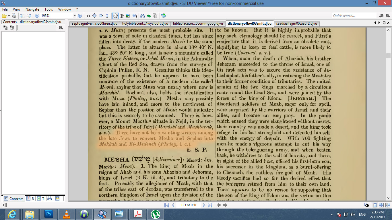 يشير سعيد في سفر التكوين اشارة واضحة لمكة و المدينة و التي كتبت في الاصحاح العاشر ، الاية رقم 30 .... " وكان مسكنهم من ميشا حينما تجيء نحو سفار جبل المشرق.." ترجمها سعيد الفيومي هكذا " و كان مسكنهم من مكة إلى أن تجئ المدينة إلى الجبل الشرقي ... " إشارة إلى بني يقطان أو قحطان لو صح القول ... http://www.kalemasawaa.com/vb/attach...1&d=1360648714 .................................................. .. http://www.kalemasawaa.com/vb/attach...1&d=1360648696 نأخذ أيضا من قاموس الكتاب المقدس هنا تحت عنوان ميشا ما يلي ... : ترجمة : " لم يكن هناك مانع بين اليهود المتأخرين من تحويل كل من ميشا و سفار إلى مكة والمدينة " قلت جميل سأعود أكتب عن سعيد الجاؤون أو سعيد الفيومي رأس الكل كما يسمونه وواضع اسس النحو العبري و هو اول من ترجم التوراة للعرب اليهود و أنشأ ما يسمى بالثقافة العربية اليهودية .... لكي يتأكد المسيحي العاقل و ليس مرتدي النت و الحفظة بدون فهم مكانة سعيد و سوف استعين أيضا مراجع و كتب كتبها مسيحيين و يهود لكي لا يكون هناك حجة ..... الله الموفق |