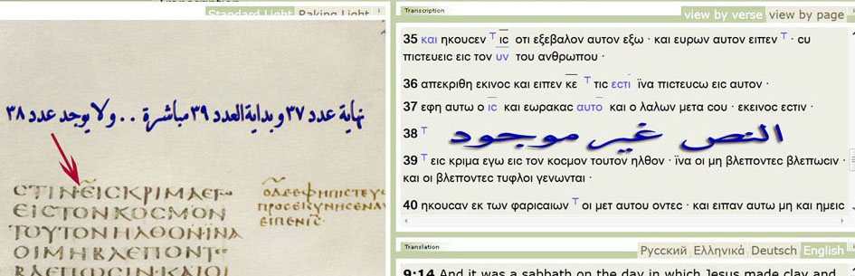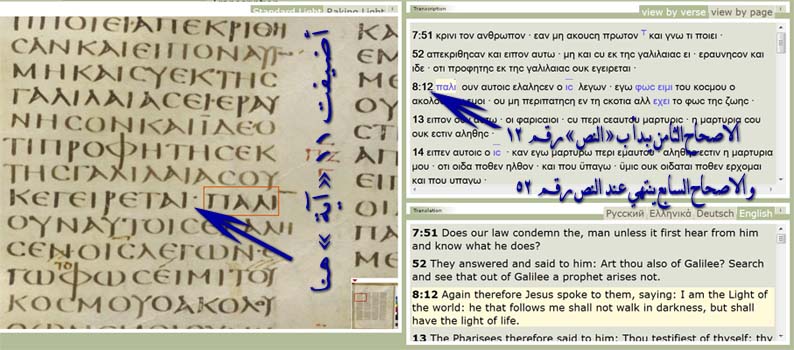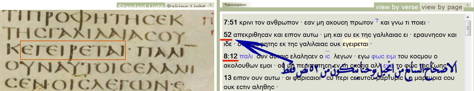نص تحت المجهر .. يوحنا 7 : 53 53. فَمَضَى كُلُّ وَاحِدٍ إِلَى بَيْتِهِ. هذا النص غير موجود في المخطوطة .. يعني افتقسه المؤلف و يجب حذفه السؤال هو : كم عدد " النصوص " في الإصحاح السابع من إنجيل يوحنا ؟ حسب النص اليوناني ( GNT ) : ـ.................... 53 حسب النص اليوناني ( Nestle-Aland) : ـ...... 53 حسب المخطوطة السينائية :ـ............................ 52 يعني النص رقم 53 مفتقس ! .. و يجب حذفه لأن " رب المسيحيين " لم " يوحي به " للمؤلف ! |