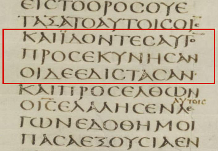 النص الثاني : مرقس 5 : 22 و هذا النص ليس فيه شبهة السجود ليسوع و يكفي لنفيه استعراض الترجمات العربية : ترجمة سميث و فاندايك ( خر عند قدميه ) و هذا يفيد معنى التوسل - الرجاء : 22. وَإِذَا وَاحِدٌ مِنْ رُؤَسَاءِ الْمَجْمَعِ اسْمُهُ يَايِرُسُ جَاءَ. وَلَمَّا رَآهُ خَرَّ عِنْدَ قَدَمَيْهِ ترجمة كتاب الحياة تقول ( ارتمى عند قدميه ) : 22. وإذا واحد من رؤساء المجمع، واسمه يايرس، قد جاء إليه. وما إن رآه، حتى ارتمى عند قدميه، و ترجمة الأخبار السارة تقول وقع على قدميه : 22. وجاء رجل من رؤساء المجمع اسمه يايرس. فلما رأى يسوع وقع على قدميه، و الترجمة اليسوعية تقول ارتمى على قدميه : 22. فجاء أحد رؤساء المجمع اسمه يائيرس. فلما رآه ارتمى على قدميه، فألفاظ " خر " و " وقع " و " ارتمى " عند قدميه لا تحمل معنى السجود و في النص اليوناني جاءت ( αυτον πιπτι προϲ τουϲ ποδαϲ αυτου ) و معناها ( جعله يقع على قدميه ) و لم يستعمل لفظ ( προσεκυνησαν ) و الذي يحمل معنى ( السجود ) |