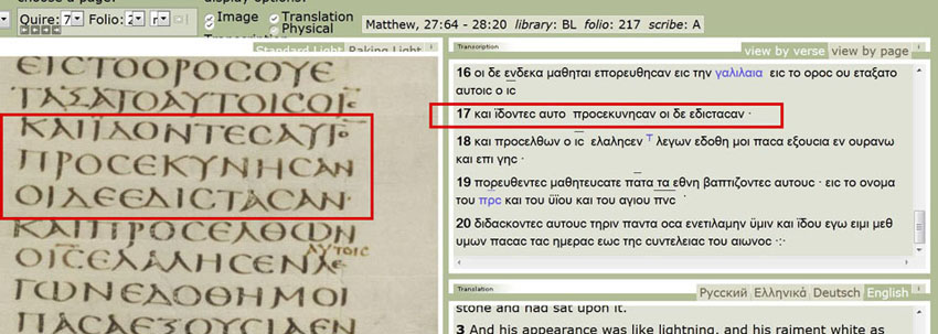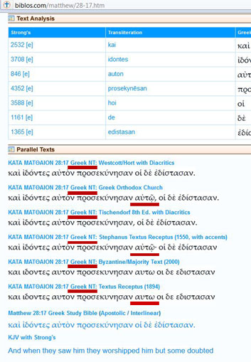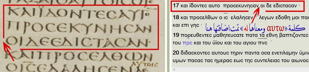 كما أنه يوجد تلاعب في ترجمات ( GNT ) .. و كلمة " له αὐτῷ" موجودة في بعضها و ليست موجودة في البعض الآخر ... الكلمة غير موجودة في هذه الترجمة : ΚΑΤΑ ΜΑΤΘΑΙΟΝ 28:17 Greek NT: Westcott/Hort with Diacritics καὶ ἰδόντες αὐτὸν προσεκύνησαν οἱ δὲ ἐδίστασαν. الكلمة موجودة في هذه الترجمة : ΚΑΤΑ ΜΑΤΘΑΙΟΝ 28:17 Greek NT: Greek Orthodox Church καὶ ἰδόντες αὐτὸν προσεκύνησαν αὐτῷ, οἱ δὲ ἐδίστασαν.\ الكلمة غير موجودة في هذه الترجمة : ΚΑΤΑ ΜΑΤΘΑΙΟΝ 28:17 Greek NT: Tischendorf 8th Ed. with Diacritics καὶ ἰδόντες αὐτὸν προσεκύνησαν, οἱ δὲ ἐδίστασαν. الكلمة موجودة في هذه الترجمة : ΚΑΤΑ ΜΑΤΘΑΙΟΝ 28:17 Greek NT: Stephanus Textus Receptus (1550, with accents) καὶ ἰδόντες αὐτὸν προσεκύνησαν αὐτῷ· οἱ δὲ ἐδίστασαν الكلمة موجودة في هذه الترجمة : ΚΑΤΑ ΜΑΤΘΑΙΟΝ 28:17 Greek NT: Byzantine/Majority Text (2000) και ιδοντες αυτον προσεκυνησαν αυτω οι δε εδιστασαν الكلمة موجودة في هذه الترجمة : ΚΑΤΑ ΜΑΤΘΑΙΟΝ 28:17 Greek NT: Textus Receptus (1894) και ιδοντες αυτον προσεκυνησαν αυτω οι δε εδιστασαν هذا معناه أنه يوجد إصرار متعمد و ممنهج لخداع النصارى و تغيير ( كلام رب اليسوعيين ) .. و أرجو من كل نصراني يقرأ هذا الكلام أن يدقق فيه و يصدق مع نفسه و يعلم أن كل هذا الكم من الفضائح من هذا النوع يقطع بوقوع التحريف في كتابه .. هذه صورة ما تجده على الرابط المشار إليه : ـ http://www.kalemasawaa.com/vb/attach...1&d=1326710818 http://biblos.com/matthew/28-17.htm |