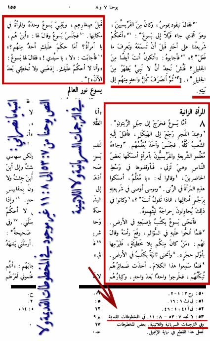 http://www.sheekh-3arb.net/vb/showthread.php?t=1076 ولكل من يبحث عن الحق أقول:- سأعرض عليكم مثالاً من تحريف أهل الكتاب لكتبهم وهو عبارة عن قصة وردت في إنجيل يوحنا، مثال صارخ علي تحريف الإنجيل الذي بين أيدي النصاري اليوم وهو قصة المرأة الزانية وأولاً أضع أمامكم نص القصة من الترجمة المتداولة بين عوام النصاري في أغلب العالم العربي - ترجمة الفاندياك - يوحنا 7: 53 فمضى كل واحد الى بيته 8: 1 اما يسوع فمضى الى جبل الزيتون 8: 2 ثم حضر ايضا الى الهيكل في الصبح و جاء اليه جميع الشعب فجلس يعلمهم 8: 3 و قدم اليه الكتبة و الفريسيون امراة امسكت في زنا و لما اقاموها في الوسط 8: 4 قالوا له يا معلم هذه المراة امسكت و هي تزني في ذات الفعل 8: 5 و موسى في الناموس اوصانا ان مثل هذه ترجم فماذا تقول انت 8: 6 قالوا هذا ليجربوه لكي يكون لهم ما يشتكون به عليه و اما يسوع فانحنى الى اسفل و كان يكتب باصبعه على الارض 8: 7 و لما استمروا يسالونه انتصب و قال لهم من كان منكم بلا خطية فليرمها اولا بحجر 8: 8 ثم انحنى ايضا الى اسفل و كان يكتب على الارض 8: 9 و اما هم فلما سمعوا و كانت ضمائرهم تبكتهم خرجوا واحدا فواحدا مبتدئين من الشيوخ الى الاخرين و بقي يسوع وحده و المراة واقفة في الوسط 8: 10 فلما انتصب يسوع و لم ينظر احدا سوى المراة قال لها يا امراة اين هم اولئك المشتكون عليك اما دانك احد 8: 11 فقالت لا احد يا سيد فقال لها يسوع و لا انا ادينك اذهبي و لا تخطئي ايضا. القصة تشغل 12 عدد في إنجيل يوحنا بداية من يوحنا 7: 53 إلي 8: 11. خطورة القصة: تكمن خطورة القصة في عدة نقاط تظهر عند قراءة شرح القصة عند المفسرين النصاري:- 1- إبطال حكم رجم الزاني الذي أتى في لاويين 20: 10 - تثنية 22: 22. 2- المسيح لم يحكم عليها بالقتل لأنه سيدفع ثمن براءتها - صلبه – "تفسير أنطونيوس فكري" 3- إظهار النقص في تشريع العهد القديم. 4- يظن النصارى أن الرحمة تتنافى مع رجم الزاني،لذلك لم يرجمها المسيح ولم يأذن لهم برجمها. 5- تعطيل كافة الحدود الموجودة في العهد القديم بحجة أنه لابد أن يكون من يقيم الحد بلا خطية. في هذا البحث سنحاول التعرف علي صحة هذه القصة من عدمه من خلال الدراسة الداخلية للنص نفسه و آراء النقاد وتصفح المخطوطات ومن خلال أقوال علماء النصارى. النقد الداخلي: عند دراسة القصة نفسها ومقارنتها بما جاء في إنجيل يوحنا يتبين لنا ما يلي: - إذا قرأنا بداية من 7: 52 وتابعنا القراءة للنص 8: 12 سنجد أن النص طبيعي جداً ولا يظهر أننا تركنا منه أي جزء )اجابوا وقالوا له ألعلك انت ايضا من الجليل.فتّش وانظر.انه لم يقم نبي من الجليل. ثم كلمهم يسوع ايضا قائلا انا هو نور العالم.من يتبعني فلا يمشي في الظلمة بل يكون له نور الحياة) يبدو النص وكأننا لم نقتطع منه شيئاً. -أين ذهب الرجل الذي كان معها في الزنى؟كلاهما مستوجب الرجم حسب ما جاء في سفر اللاويين. - عند قراءة ما قبل القصة وما بعدها نلاحظ أن يسوع يبدو وكأنه يتحدث مع نفسه ففي يوحنا8: 12 نقرأ ثم كلمهم يسوع أيضاً قائلاً....كيف هذا وهم(الكتبة وافريسيين) قد ذهبوا وتركوه معه المرأة؟ يبدو أن يسوع كان مختلاً وهذا ما لا يقوله مؤمن...حااشاااا - كاتب الإنجيل لا يستخدم كلمتي الكتبة γραμματεις والفريسيين φαρισαιοι أبداً لكنه يستخدم بدلاً من الكلمتين كلمة اليهود ιουδαιοι ، وذكر الأب متى المسكين في شرح إنجيل يوحنا: "ذكرُ كلمة "الكتبة" مع "الفريسيين" ليس أصلاً من استخدام ق. يوحنا وهي تخصيص للجماعة المدققة ، ويكني عن الإثنين في إنجيل يوحنا عادة بـ"اليهود" ." شرح إنجيل القديس يوحنا- المؤلف الأب متي المسكين طبعة 1990- مطبعة دير القديس أنبا مقار - وادي النطرون.ص511. - كلمة الكتبة γραμματεις لم تذكر في إنجيل يوحنا أبداً غير هذه المرة. - كاتب إنجيل يوحنا لا يستخدم كلمتي جبل الزيتون ορος των ελαιων أبداً، فلم يَذكُر هذا التعبير في الإنجيل أبداً في غير هذه القصة. هذا جدول مبسط يوضح الكلمات التي لم تسخدم في إنجيل يوحنا إلا في هذه القصة :- http://img112.imageshack.us/img112/2551/truetr1.gif يتبين من النقد الداخي للقصة ومقارنتها باسلوب إنجيل يوح