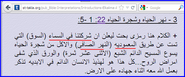 كل تفسير لايتعارض مع الآخر فعليك تثبت ان تفسير انة اعلن انة لا يتكلم عن الثالوث فلا تاتى بتفسير يفسر النص يتفق مع التفسير السابق ولا يتعارض معاة الإصحاح الثاني والعشرون 22: 1 و اراني نهرا صافيا من ماء حياة لامعا كبلور خارجا من عرش الله و الخروف ماء الحياة =الروح القدس الله = الاب الخروف = الابن فهل تستطيع ان تثبت غير ذلك .؟ والمفسر يقول هنا أشارة لثالوث الأقدس أى أن خذ بالك جيداً من هذة النقطة والعلماء قالوا يقول العلامة ترتليان إنه لا يمكننا تفسير هذا النص تفسيرًا حرفيًا. ففي الحياة الأبدية لا توجد أنهار ولا ساحات ولا أشجار. وتظهر رمزية هذه الأوصاف في حديثه عن شجرة الحياة أنها قائمة وسط ساحة المدينة، وفي نفس الوقت هي بذاتها قائمة على شاطئ النهر من الجانبين. فكيف يكون هذا لو كان ذلك بتفسير حرفي؟ وهذا يعضد التفسير الذى وضعتة لك انها اشارة . فهل تريد كتاب يقول فية "وقد اجمعوا العلماء على انة الثالوث الأقدس"اذا كان هذا مطلبك فهذة لا تعتبر لغة حوار نهائى بل لغة جهل فهل تستطيع تقدم مفسر لم يقول نة ليس الثالوث .؟ شرح الكتاب المقدس - العهد الجديد - القمص تادرس يعقوب ملطي ويرى القديس إمبروسيوس[154]أنه الروح القدس الذي لا يشرب منه إلاّ الذي يؤمن بالسيد المسيح، القائل: "إن عطش أحد فليقبل إلي ويشرب. من آمن بي كما قال الكتاب تجري من بطنه أنهار ماء حي". قال هذا عن الروح الذي كان المؤمنون به مزمعين أن يقبلوه (يو 7: 37-39). هذا هو روح الآب والابن منبثق من الآب مستقر في الابن، أرسله الابن من عند الآب ليبكتنا ويقدسنا ويقودنا حتى نبلغ العرس السماوي. هذا هو النهر الخالد الذي روى ويروي العروس. شرح الكتاب المقدس - العهد الجديد - القس أنطونيوس فكري آيات 2،1 "و اراني نهرا صافيا من ماء حياة لامعا كبلور خارجا من عرش الله و الخروف. في وسط سوقها وعلى النهر من هنا ومن هناك شجرة حياة تصنع اثنتي عشرة ثمرة وتعطي كل شهر ثمرها وورق الشجرة لشفاء الامم". سمعنا في سفر التكوين عن نهر يسقى الجنة، وأن الجنة بها شجرة حياة (تك9،10:2) وها نحن في ختام أسفار الكتاب المقدس نسمع عن النهر وعن شجرة الحياة في أورشليم السماوية، فالله يقودنا لما أراده لنا منذ البدء. والنهر = هو إشارة للروح القدس (يو37:7-39) + (مز5،4:46) + (أش12:66-14). فالروح القدس كنهر يفيض حياة وعزاء وسلام. والشجرة = هى المسيح (مز1:1-6) وكون أن الشجرة موجودة على النهر فالمعنى أن الحياة التي أعطاها لنا المسيح بتجسده وبجسده ودمه كانت تصلنا بالروح القدس، الذي أرسله لنا المسيح (يو26:5 + يو7:16). من ماء حياة = راجع (يو14،10:4) فماء الحياة هو روح الله أو حياة الله. حياة الله خارجة ومتدفقة منه لتملأ الناس حياة وبر وعزاء وفرح وسلام ومحبة حقيقية. صافيا = أما أنهار العالم أي مصادر الملذات العالمية والأمجاد العالمية. فهي معرضة دائما أن تتعكر، بل هي مشبهة بماء البحر المالح. والله سيقتادنا إلى هذا النهر (ينابيع الماء الحية رؤ17:7) لنرتوى منه فنمتلىء فرحا حقيقيا لا يشوبه أي نوع من الحزن ونمتلىء سلاما حقيقيا بلا أي هم أو قلق. ونمتلىء محبة حقيقة لكل الخليقة ولله أولا. وهذه المحبة هي السبب في الفرح والسلام. والمحبة التي سيعطيها لنا الروح القدس لم نختبر مثلها على الأرض، فسنحب كل من في السماء وسنفرح لهم، حتى لو كان لهم مجد ودرجات أعلى منا بكثير. في السماء يمكننا أن نطبق الآية "فرحا مع الفرحين" (رو15:12) بصورة كاملة ومطلقة. هي محبة بلا حسد ولا غيرة. محبة صافية، وهذا معنى النهر الصافى. فالمحبة ستكون صافية بلا حقد ولا حسد والفرح سيكون صافيا بلا حزن.. وهكذا. والحياة التي ستتدفق فينا هي حياة ابدية بلا موت. لامعا كبلور = البلور يعكس الأنوار. والمعنى أن الروح القدس سيعكس الأمجاد الإلهية فنستمتع بها، وهذه تملأ النفس فرحا وسلاما. ألم يقل السيد المسيح عن الروح القدس أنه يأخذ مما له ويخبرنا (يو14:16). وكل هذا يفعله الروح القدس الأن، ولكن ما نحصل عليه الآن هو مجرد عربون ما سيعطيه لنا في الأبدية (1كو10،9:2 + 1كو12:13) فالبلور اللامع هو التعبير البشرى ع