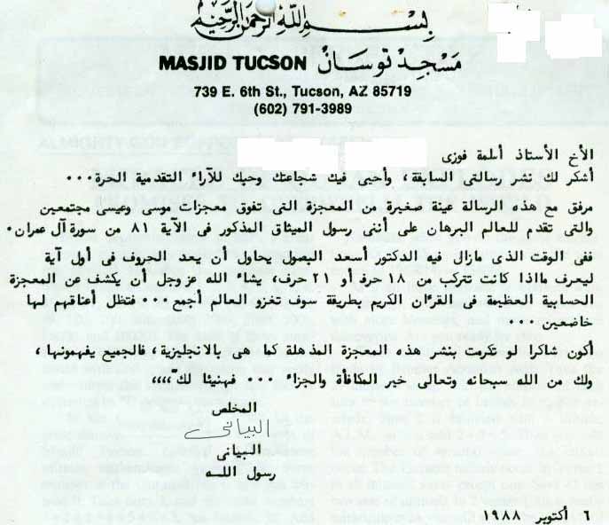 بسم الله الرحمن الرحيم فقط حتى يزول الاشكال وتدليس وأوهام البياني رشاد خليفة المجنون الذي قتل أباه ليمنعه من إلقاء خطبة الجمعة في مسجد توسان !!!! حذف أتباعه اسمه الأول وكان بالأصل ( محمد رشاد خليفة ) وهناك موقع وهو مسجد توسان في أريزونا اقتباس: