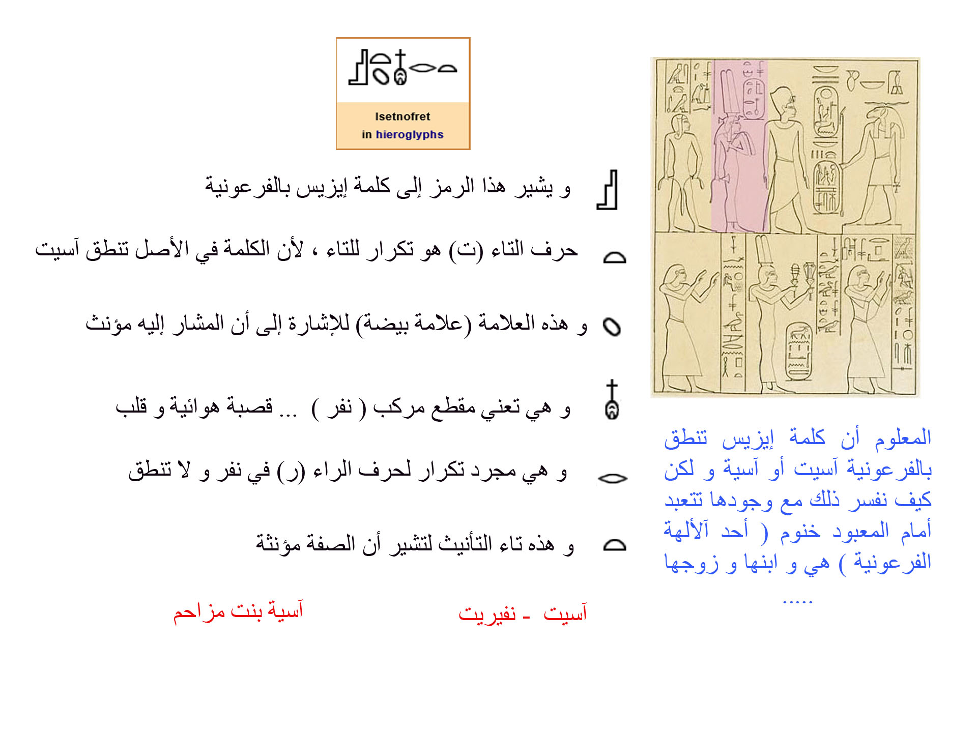 قلنا سابقا أن أسية بنت مزاحم أصلها ليس فرعوني ؟؟؟ ماذا عن ايزيس - نيفيرت ؟؟؟ ايزيس - نيفيريت هي أيضا ليست ذات أصل فرعوني !! ايزيس - نيفيريت تنتمي لمنطقة سوريا - فلسطين ! قد يقول نصراني مشكك ، ما العلاقة بين الاسمين ؟؟؟ الاختلاف واضح بين اسمي أسية بنت مزاحم و ايزيس - نيفيرت ؟؟؟ نجيبه بحمد الله ، الأرجح أن اسم ايزيس - نيفيرت هو الاسم الفرعوني ل أسية بنت مزاحم ! ما الدليل على كون ايزيس-نيفيرت هي نفسها أسية بنت مزاحم ؟؟؟ الدليل : هو كون ابنة ايزيس - نيفيرت الكبرى كانت تُدعى بنت أنات !!!! مصادفة غريبة أن نجد كلمة " بنت " في الاسمين : أسية بنت مزاحم بنت أنات الأغرب هو كيف سمح رمسيس الثاني باعطاء لقب بنت انات - و هو اسم غير فرعوني - لابنته ؟؟؟؟ بنت أنات معناها بنت الالهة " أنات " الهة الكنعانيين الوثنية !!! علامة استفهام كبرى ؟ http://www.kalemasawaa.com/vb/upload...1344508367.png http://www.kalemasawaa.com/vb/upload...1344508459.png بنت = fille http://www.egyptos.net/egyptos/pharaon/isis-nofret.php يُتبع ... |