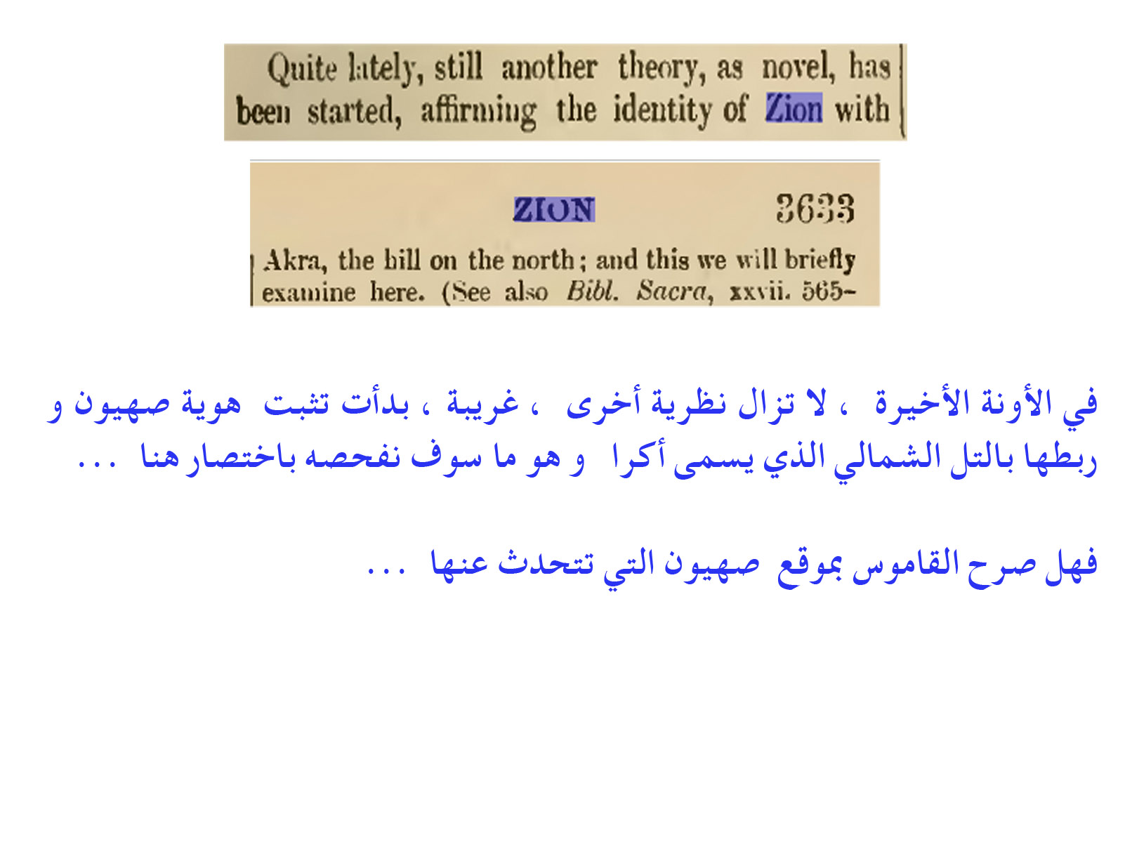 quite lately , still another theory ....... سأترجم لك هذه الجزئية و عليك بالبحث عنها في قاموس سميث اشهر قاموس للكتاب المقدس ماذا يقول عن صهيون .. " في الاونة الاخيرة ، برزت نظرية أخرى جديدة ، تؤكد هوية و أصل صهيون و ربطها بأكرا ، ذلك التل المتواجد في الشمال ..... " عرفت انه لازالت تطرح النظريات للبحث عن صهيون المفقودة وسط ركام القدس .... اضخم قاموس للكتاب المقدس ... لم ينطق و يحدد لنا حقيقة موقع صهيون ... و من الممكن ان نطالع في الغد نظرية جديدة تقول لنا ان صهيون في مكان ما ... داخل القدس ... كما تعلم فبيت ايل " بيت الله " يوجد هناك و يحج الناس اليه كل عام ..... هناك حلقة مفقودة .... اين بيت ايل ..... و اين يحج الناس .... و لماذا بعدما أسس ابراهيم عليه السلام البيت لم يحج اليه جموع اليهود في القدس ... فاندثر ..... و بقيت الكعبة ؟؟؟؟؟؟؟ سوف اكمل حواري فلا تنصرف هذا رجاء و ليس أمراً |