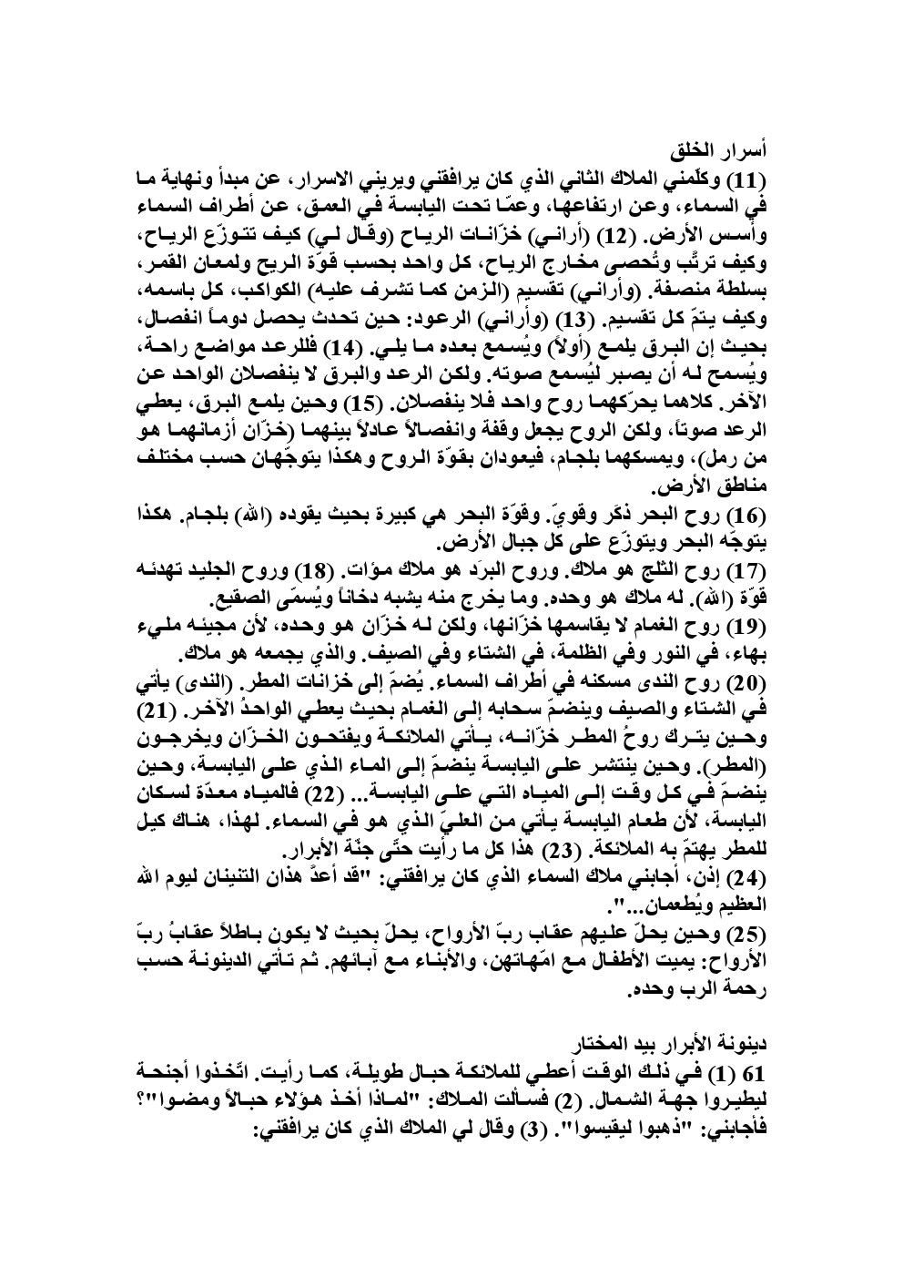 و هو يتحدث عن مختار البر و الحق أى النبي صلى الله عليه و سلم و عن الأبرار و منازلهم فى الآخرة و مرافقتهم للقديسين و الملائكة و نعرض النصوص و لنقرأ من آخر الصفحة الأولى تحت عنوان ( رأى أخنوخ سعادة الأبرار و مختار البر) حتى عنوان (أخنوخ و الملائكة يباركون الرب) فى الصفحة الثانية http://www.kalemasawaa.com/vb/attach...1&d=1392402991 http://www.kalemasawaa.com/vb/attach...1&d=1392402991 و فى الجملة الخامسة نقرأ ( هناك رأيت بعينى أنهم يقيمون مع ملائكة البر و يرتاحون فى رفقة القديسين) أما إقامتهم مع ملائكة البر فهى ما أخبرنا الله تعالى عنه فى القرآن الكريم فى سورة الرعد: ( الذين يوفون بعهد الله ولا ينقضون الميثاق ( 20 ) والذين يصلون ما أمر الله به أن يوصل ويخشون ربهم ويخافون سوء الحساب ( 21 ) والذين صبروا ابتغاء وجه ربهم وأقاموا الصلاة وأنفقوا مما رزقناهم سرا وعلانية ويدرءون بالحسنة السيئة أولئك لهم عقبى الدار ( 22 ) جنات عدن يدخلونها ومن صلح من آبائهم وأزواجهم وذرياتهم والملائكة يدخلون عليهم من كل باب( 23 ) سلام عليكم بما صبرتم فنعم عقبى الدار ( 24 ) ) فالأبرار مقيمون مع الملائكة و الملائكة تدخل عليهم من كل باب لتحييهم و تهنئهم بدخول الجنة أما رفقة القديسين فالقديسون هم بلا شك النبيون و الصديقون و الشهداء و الله عز و جل يقول : (وَمَنْ يُطِعِ اللَّهَ وَالرَّسُولَ فَأُولَٰئِكَ مَعَ الَّذِينَ أَنْعَمَ اللَّهُ عَلَيْهِمْ مِنَ النَّبِيِّينَ وَالصِّدِّيقِينَ وَالشُّهَدَاءِ وَالصَّالِحِينَ ۚ وَحَسُنَ أُولَٰئِكَ رَفِيقًا) النساء 69 أما الجملة التى تقول : ( هم يصلون يتوسلون يتضرعون من أجل البشر) فهى تنطبق على الملائكة و المؤمنين فأما الملائكة فهى تدعو للمؤمنين بنص القرآن الكريم فى سورة غافر: ( الذين يحملون العرش ومن حوله يسبحون بحمد ربهم ويؤمنون به ويستغفرون للذين آمنوا ربنا وسعت كل شيء رحمة وعلما فاغفر للذين تابوا واتبعوا سبيلك وقهم عذاب الجحيم ( 7 ) ربنا وأدخلهم جنات عدن التي وعدتهم ومن صلح من آبائهم وأزواجهم وذرياتهم إنك أنت العزيز الحكيم ( 8 ) وقهم السيئات ومن تق السيئات يومئذ فقد رحمته وذلك هو الفوز العظيم ( 9 ) ) و أما المؤمنون و الأبرار فيشفعهم الله فى أهل النار يوم القيامة - إذا خَلَصَ المؤمنُونَ مِنَ النارِ وأَمِنُوا ؛ ف [ والذي نَفسي بيدِهِ ! ] ما مُجَادَلَةُ أَحَدِكُمْ لِصاحِبِه في الحَقِّ يكونُ لهُ في الدنيا بِأَشَدَّ من مُجَادَلَةِ المؤمنينَ لِرَبِّهِمْ في إِخْوَانِهِمُ الذينَ أُدْخِلوا النارَ . قال : يقولونَ : رَبَّنا ! إِخْوَانُنا كَانُوا يُصَلُّونَ مَعَنا ، ويَصُومُونَ مَعَنا ، ويَحُجُّونَ مَعَنا ، [ ويجاهدونَ مَعَنا ] ، فَأَدْخَلْتَهُمُ النارَ . قال : فيقولُ : اذْهَبُوا فَأَخْرِجُوا مَنْ عَرَفْتُمْ مِنْهُمْ ، فيأتونَهُمْ ، فَيَعْرِفُونَهُمْ بِصُوَرِهِمْ ، لا تَأْكُلُ النارُ صُوَرَهُمْ ، [ لمْ تغشَ الوجهُ ] ، فَمِنْهُمْ مَنْ أَخَذَتْهُ النارُ إلى أنْصافِ ساقيْهِ ، ومِنْهُمْ مَنْ أَخَذَتْهُ إلى كَعْبَيْهِ [ فيخرجَونَ مِنْها بشرًا كثيرًا ] ، فَيقولونَ : رَبَّنا ! قد أَخْرَجْنا مَنْ أَمَرْتَنا . قال : ثُمَّ [ يعودونَ فيتكلمونَ ف ] يقولُ : أَخْرِجُوا مَنْ كان في قلبِهِ مثقال دينارٍ مِنَ الإيمانِ . [ فيخرجَونَ خلقًا كثيرًا ] ، ثُمَّ [ يقولونَ : رَبَّنا ! لمْ نَذَرْ فيها أحدًا مِمَّنْ أَمَرْتَنا . ثُمَّ يقولُ : ارْجِعُوا ، ف ] مَنْ كان في قلبِهِ وزْنُ نصفِ دِينارٍ [ فأخَرَجَوهُ . فيخرجَونَ خلقًا كثيرًا ، ثُمَّ يقولونَ : رَبَّنا ! لمْ نَذَرْ فيها مِمَّنْ أَمَرْتَنا . . . ] ، حتى يقولَ : أخَرَجُوا من كان في قُلْبِه مثقال ذرةٍ . [ فيخرجَونَ خلقًا كثيرًا ] ، قال أبو سعيدٍ : فمَنْ لمْ يُصَدِّقْ بهِذا الحَدِيثِ فليَقرأْ هذه الآيَةَ : إِنَّ اللَّهَ لَا يَظْلِمُ مِثْقَالَ ذَرَّةٍ وَإِنْ تَكُ حسنةً يُضَاعِفْهَا وَيُؤْتِ مِنْ لَدُنْهُ أَجْرًا عَظِيمًا [ النساء / 40 ] ، قال : فَيقولونَ : رَبَّنا ! قد أَخْرَجْنا مَنْ أَمَرْتَنا ، فلمْ يَبْقَ في النارِ أحد