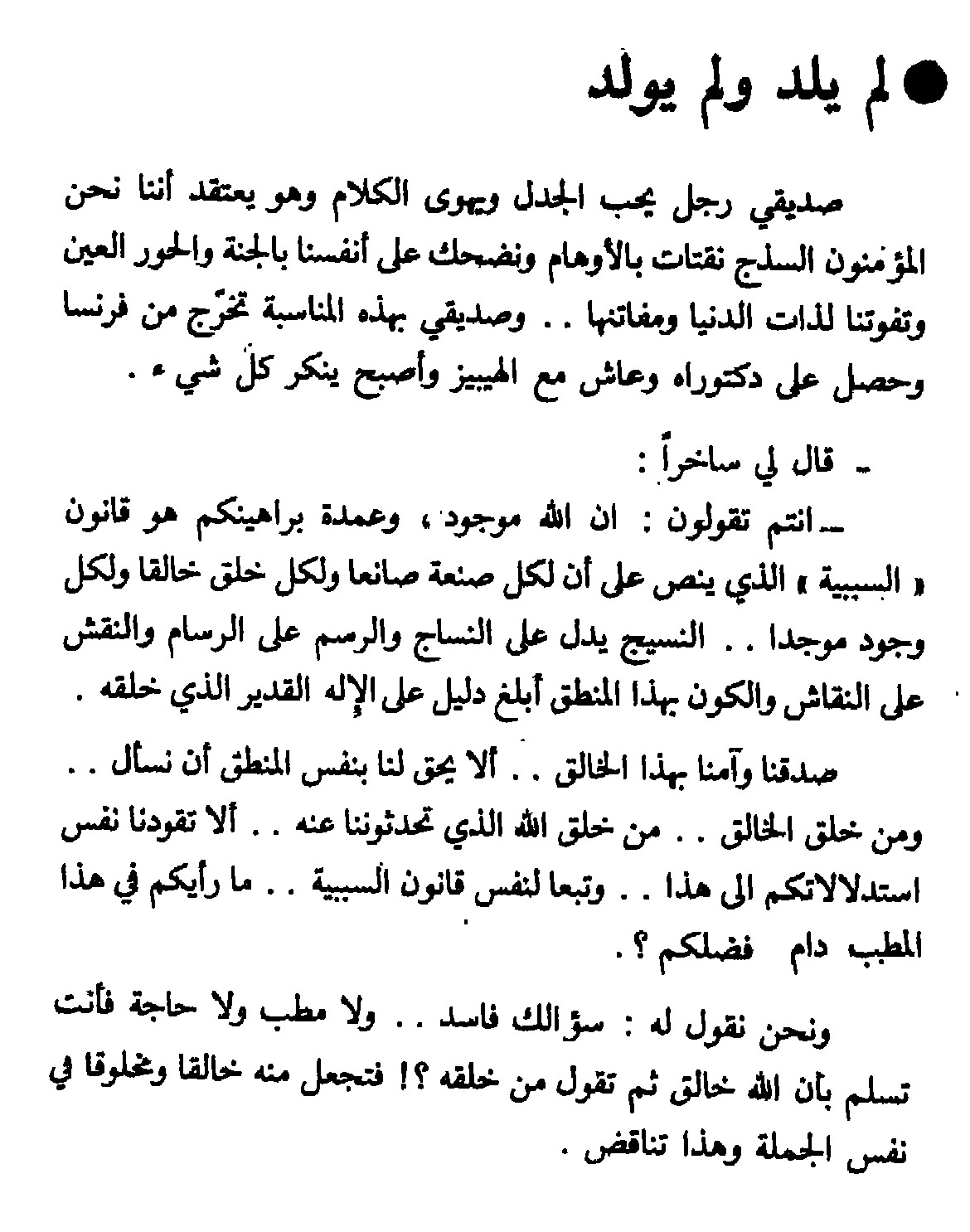 ربما أعطتك الكنيسة فكرة خاطئة عن معبود المسلمين من هو ؟؟ لذلكَ وجب التدّخل لتصحيح تمثّلاتك ، الله مُبدع الكون العظيم هو معبودنا ، ليس له ندّ أو نظير أو شبيه ، هو خالق جميع ما يُرى و ما لا يُرى ، لا تُدركه الأبصار وهو يدرك الأبصارسبحانه ، لم يلد ولم يولد ولم تكن له لا زوجة ولا ولد . يقول جلّ و علا في سورة الإخلاص : قُلْ هُوَ اللَّهُ أَحَدٌ (1) اللَّهُ الصَّمَدُ (2) لَمْ يَلِدْ وَلَمْ يُولَدْ (3) وَلَمْ يَكُن لَّهُ كُفُوًا أَحَدٌ (4) برجاء مراجعة المواضيع التالية : نسف شبهة مَن قال لله صاحبة [ زوجة / عروس ] و ولدا ؟ هل المسلمون وثنيون ؟؟؟ |