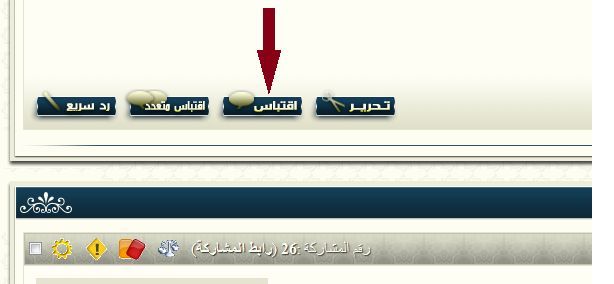 أختي الكريمة يمكنك عمل الاقتباس كالآتي: 1) نسخ النص الذي تريدين اقتباسه إلى صندوق المشاركة --> ثم تظليله --> ثم الضغط على هذا الزر http://www.kalemasawaa.com/vb/images/toolbox/quote.gif وهذا هو مكانه في صندوق الرد http://www.kalemasawaa.com/vb/attach...1&d=1282047843 __________________________________________________ __ 2) الضغط على زر اقتباس بجوار المشاركة التي تريدين اقتباسها وهذا هو مكانه http://www.kalemasawaa.com/vb/attach...1&d=1282047843 __________________________________________________ _ 3) إذا أردت الاقتباس من أكثر من مشاركة - يمكنك اتباع ما في الخطوة الأول لكل مشاركة أو اتباع الآتي - الضغط على زر اقتباس متعدد الموجودة بجوار المشاركات http://www.kalemasawaa.com/vb/newrep...wreply&p=54494 وهذا هو مكانه http://www.kalemasawaa.com/vb/attach...1&d=1282047843 بجوار المشاركات التي ترغبين في اقتباسها ثم أضغطي إضافة رد أسأل الله أن ينفعك به |