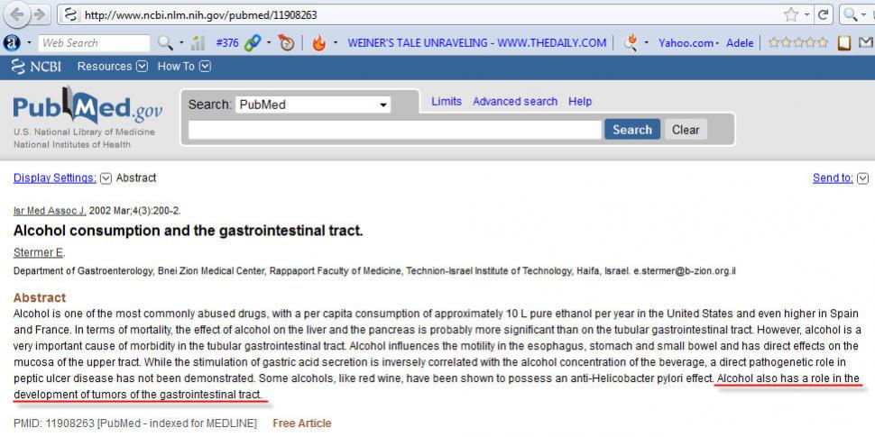 فهذا بحث ألماني من موقع الـ Pubmed للأبحاث الطبية عن أضرار شرب الخمر على المعدة والمريء http://www.kalemasawaa.com/vb/attach...1&d=1307362491 http://www.ncbi.nlm.nih.gov/pubmed/16508284 وقد توصلوا فيه أن شرب الخمر يؤدي إلى زيادة ملحوظة في الإصابة بأمراض كل من المريء والمعدة __________________ وهنا بحث آخر إسرائيلي http://www.kalemasawaa.com/vb/attach...1&d=1307362491 http://www.ncbi.nlm.nih.gov/pubmed/11908263 يؤكد أن الخمر له دور في نشوء أورام الجهاز الهضمي والذي منه المعدة ! |