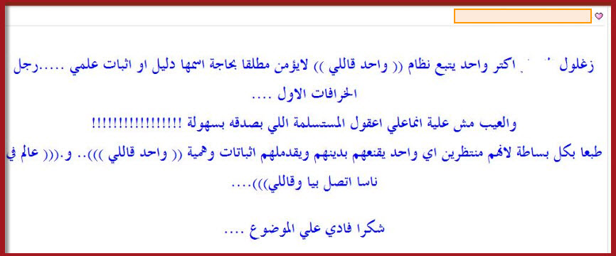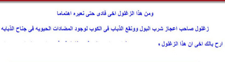 تحياتى لك .. ولكن الحقيقة د/ زغلول النجار لم يخطىء وإن هذا القول علمى تجريبى بحت مشهور فى العالم .. ولكن لماذا نذهب بعيدا الأمر معجزة.. إن كنت قرأت فى الكيمياء الحيوية كنت ستعلم أنه قبل سنة 1939 كانو يربون الذباب حتى يستخرجو منه المضادات الحيوية (( anti buotic)) ... وهذا الشىء مشهور عالميا فى ساحة العلم ويمكنك أن تسأل أى جراح عظام عن هذا الامـر ... تأتى الدراسات الغربية تقول بالنص : The surface of flies is the last place you would expect to find antibiotics بمعنى هذا أن سطح الذباب هو آخر ما يتصوره الإنسان أن يجد عليه مضادات حيوية. يمكنـك الإستعانة بموقع مقالات الأطباء العلمية ... موقع لذكر الدراسات الطبية الغربية .. http://www.pharmajo.com/articles-research/17.html وهذا البحث هو للعالمة الأسترالية (( جوان كلارك )) ... أخذت فى هذا الإكتشاف الدكتوراه والشهرة حول العالم .. وهذا هو الخبر من المجلات الأمريكية وهذا جزء من الخبر .. As did all the adult fly species, including the Queensland fruit fly (which at this point requires antibacterial protection because it has contact with other flies and is mobile). Such properties were present on the fly surface in all four species, although antibacterial properties occur in the gut as well. "You find activity in both places," said Ms Clarke. "The reason we concentrated on the surface is because it is a simpler extraction." The antibiotic material is extracted by drowning the flies in ethanol, then running the mixture through a filter to obtain the crude extract. When this was placed in a solution with various bacteria including E.coli, Golden Staph, Candida (a yeast) and a common hospital pathogen, antibiotic action was observed every time. "We are now trying to identify the specific antibacterial compounds," said Ms Clarke. Ultimately these will be chemically synthesised. Because the compounds are not from bacteria, any genes conferring resistance to them may not be as easily transferred into pathogens. It is hoped this new form of antibiotics will have a longer effective therapeutic life. الترجمة كما فعل كل الذباب البالغ، بما في ذلك ولاية كوينزلاند ذبابة الفاكهة (في هذه المرحلة التي تتطلب الحماية المضادة للبكتيريا لانها على اتصال مع الذباب الآخر ومتحرك). وكانت هذه الخصائص موجودة على سطح الطيران في جميع الأنواع الأربعة، على الرغم من خصائص مضادة للجراثيم يحدث في الأمعاء أيضا. "لأنك تجد نشاطا فى كلا المكانيين" ... قالته الآنسة كلارك. "والسبب ركزنا على السطح هو لأنها أبسط استخراج".ويتم استخراج هذه المواد المضادات الحيوية بغمس الذباب في الايثانول، ثم نمرر المحلول خلال مرشح للحصول على المادة الخام وعندما تم وضع هذا في التوصل إلى حل مع بكتيريا مختلفة بما في ذلك القولونية، المكورات العنقودية الذهبية، المبيضات (أ الخميرة) والممرض مستشفى المشتركة، لاحظ عمل المضادات الحيوية في كل مرة "نحن نحاول الآن إلى التعرف على المركبات المحددة للجراثيم"، قالت السيدة كلارك. في نهاية المطاف سوف يتم تصنيعه كيميائيا هذه. لأن هذه المركبات ليست من البكتيريا، قد لا أية جينات تشكل مقاومة لها من السهل أن تتحول إلى مسببات الأمراض. والأمل معقود على هذا الشكل الجديد من المضادات الحيوية سيكون له عمر أطول للفعالية العلاجية. وهذا هو الحديث المعجزة . قال الرسول : اذا وقعتالذبابة فى اناء أحدكم وفى رواية (فى شراب أحدكم ) وفى رواية فى (طعام أحدكم ) ثم أكمل .. فليغمسها ثم ليطرحها لان فى احد جناحيها الداء وفى الآخر الشفاء . والحديث يُخبر ولا يلزم من باب لا ضرر ولا ضرار.. شكرا لك صديقى الطيب .. تحياتى |