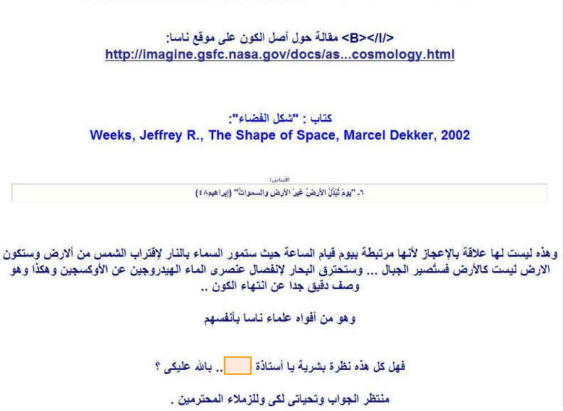 نعم ياسيدة قبطة هذه آية عظيمة وليست نظرية بشرية بل هى النظرية العالمية السائدة لنهاية الكون أنظى الآية (( يوم نطوى السماء كطى السجل للكتب )) هل سمعتى عن تشبيه وكالة ناسا للكون بالورقة المسطحة ؟ اسمعى ماذا قالو اعتقد منذ 2004 ؟ "The most widely accepted theory predicts that the density of the Universe is very close to the critical density, and that the shape of the Universe should be flat, like a sheet of paper." وهذا يعني: "إن النظرية الأكثر والأوسع قبولاً تتوقع بأن كثافة الكون قريبة جداً من الكثافة الحرجة، وأن شكل الكون ينبغي أن يكون منبسطاً، مثل صفيحة من الورق". الآن أيقنو ان حقيقة أن الكون مسطح ويشبه الورقة! وهذه صورة من ناسا لرسم الكون ... تفضلى http://www.hadielislam.com/arabic/si...s/pic_5130.jpg لقد أخبرنا القرآن بذلك منذ 1400 سنة .. (( كما بدأنا أول خلق نعيده )) هل أحتاج ان أذكركم بكلام علماء الكونيات بأن كون ثانى سيخلق بنفس طريقة هذا الكون .. (( إذا إنطوى الكون وإنسحق من الممكن أن يتبع هذا إنفجار جديد كالذى حصل وكن كوننا هذا )) ((يوم نطوِي السماءَ كَطَيِّ السِّجِلِّ للكتب، كما بدأنا أولَ خلقٍ نُعِيدُهُ وَعْداً علينا إنا كنا فاعِلين)) </B></I> مقالة حول أصل الكون على موقع ناسا: http://imagine.gsfc.nasa.gov/docs/as...cosmology.html كتاب : "شكل الفضاء": Weeks, Jeffrey R., The Shape of Space, Marcel Dekker, 2002 اقتباس: