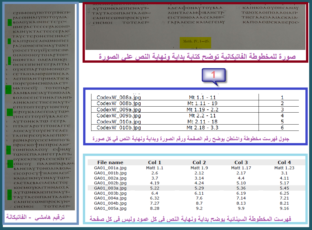 فهرست مخطوطة ليننجراد مقدمة : فهرست المخطوطات 1- المقصود بالفهرست هو تحديد مجال النص داخل الصورة او الصفحة من الكتاب ، بمعني ان النص داخل الصفحة او الصورة يبدأ من الاصحاح --- العدد ---- ، الي ، الاصحاح --- العدد --- ويكتب ذلك علي كل صورة كما يتضح من الصورة رقم 1 2- ويتم عمل جدول باجمالي الصفحات وبداية ونهاية النص في كل صفحة مثل فهرست المخطوطة واشنطن في الصورة رقم 1 3- وقد يكون الفهرست اكثر دقة فيكتب بداية ونهاية النص في كل عمود وليس في كل صفحة كما في فهرست السينائية بالصورة رقم 1 4- وقد يتم كتابة ارقام الاعداد علي هامش المخطوطة كما في الفاتيكانية بالصورة رقم 1 http://www.kalemasawaa.com/vb/attach...1&d=1352571251 5- ولقد سبق واعددت فهرست مخطوطة حلب ، فبعد ان حذفت الصور المكررة من الملف واعدت ترقيم الصور قمت باعداد الفهرست وهو منشور مع مخطوطة حلب في موقع بن مريم 6- ولقد حاولت ان اقوم بترقيم الاعداد داخل المخطوطة كما في الصورة رقم 2 لمخطوطة سريانية رقم 10 من مجموعة منجانا ، وحينما ارسلت الصورة للموقع اصابهم غضب شديد واخبروني ان الكتابة داخل متن المخطوطة هي جريمة في علم المخطوطات تشبه جريمة القتل لانها تفقد المخطوطة مصداقيتها 7- واخبروني ان الذين يقرأون المخطوطة لاشك انهم يعرفون تلك اللغة وان فائدة الفهرس هو توفير بعض الوقت اثناء البحث عن نص معين فيبدأ الباحث بالبحث في صورة معينة وليس في كل الصور http://www.kalemasawaa.com/vb/attach...1&d=1352571737 8- هذا كشاف عام بمجمل باسفار مخطوطة لينينجراد وصفحات البداية والنهاية لكل سفر |