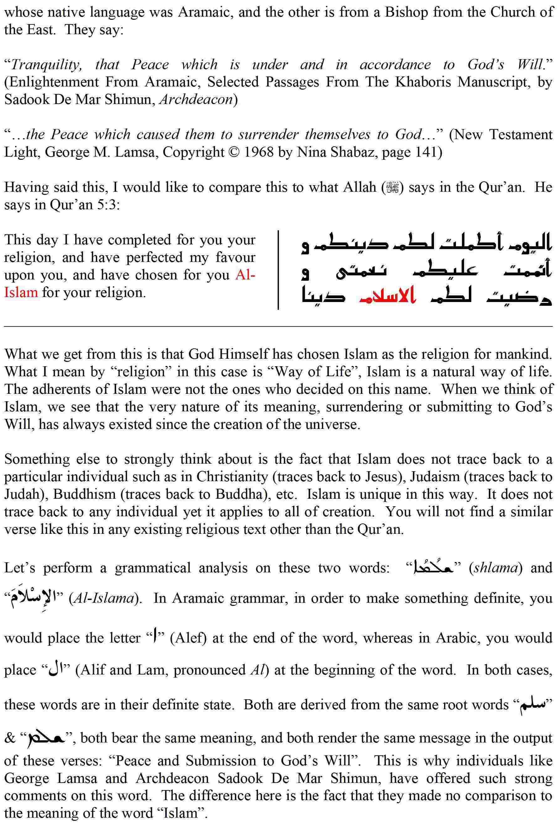 Were there Muslims before Islam هل كان هناك مسلمين قبل الاسلام؟ Recent Discoveries الاكتشافات الاخيرة Father Dr. Labib Kobti, an Arab Christian priest, in one his articles titled The Christian Arab Heritage(available on his web site at: http://www.al-bushra.org/arbhrtg/arbxtn04.htm ) says: "Recently Father Pecerillo, a famous Franciscan Archaeologist, found more than twenty churches in Madaba at the south of Jordan. From the Fourth Century, we found houses in Syria, Lebanon, Iraq and Palestine with this inscription in Arabic :"Bism El-Lah al Rahman al Rahim" that showed that Christians were the first to use this name so as to indicate their belief in the Holy Trinity, more than two hundred years before Islam الاب الدكتور لبيب كوبتي ، وهو كاهن مسيحي عربي كتب في احدى مقالاته بعنوان 'التراث العربي المسيحي الموجودة على الموقع التالي ... يقول: وجد مؤخرا الاب بيسريلو عالم آثر الشهير اكثر من عشرين كنيسة في جنوب الاردن من القرن الرابع ومنازل في سوريا ولبنان والعراق وفلسطين نقش باللغة العربية "بسم الله الرحمان الرحيم ' وهذا يثبت ان المسيحيين اول من استخدم هذا الاسم وذلك قبل مئتي عام قبل الاسلام." What this Christian priest is revealing is extremely important for the following reasons (1) This Arabic phrase "Bism El-Lah al-Rahman al-Rahim" ( بِسۡمِ ٱللهِ ٱلرَّحۡمَـٰنِ ٱلرَّحِيمِ ) that the priest says has been discovered in houses of Christians dating back to the 4th Century is the same phrase that most Suras (Chapters) of the Quran start with. This phrase can be translated as "In the name of Allah the Most Compassionate, Most Merciful (2)". The fact that this phrase was found in houses of Christians dating back to the 4th Century, meaning three centuries before the Quran was revealed to Prophet Mohammad. This indicates that the beliefs of early Christians were very similar to the beliefs of Muslims. In other early Christians did not believe in the Trinity: "In the name of Father, Son, Holy Spirit", instead they the Muslims phrase "In the name of Allah the Most Compassionate, Most Merciful". This is proof that Jesus was a Muslim and he preached Islam, and early followers of Jesus were Muslims. Jesus using the word "Muslim" in Luke 6:40 Luke 6:40 (N.I.V. Bible) "A student is not above his teacher, but everyone who is fully trained will be like his teacher." Luke 6:40 (King James Version) 40 The disciple is not above his master: but every one that is perfect shall be as his master. Luke 6:40 (American Standard Version) 40 The disciple is not above his teacher: but every one when he is perfected shall be as his teacher. Let us look at what Jesus said in Luke 6:40 in Aramaic language translated into Hebrew as shown below : http://www.kalemasawaa.com/vb/attach...1&d=1343787935 "Ein talmeed na'leh 'al rabbo; shekken kal adam she'MUSHLAM yihyeh k'rabbo." Note: Aramaic and Hebrew are read from right to left, which is opposite to English. Translation in English: "No student can be above his teacher, but everyone who is a MUSLIM can be as his teacher." |