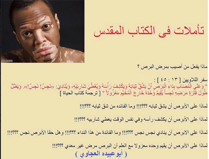 يشق ثيابه.! يكشف رأسه.! يغطي شاربيه ! ويقول عن نفسه وينادي "نجس"! إنها قمة الإهانة لمرضى البرص..ألا يكفي معاناتهم النفسية مع هذا المرض ليزيدهم الكتاب المقدس إهانة وإحساس بالقهر والدونية..!! |