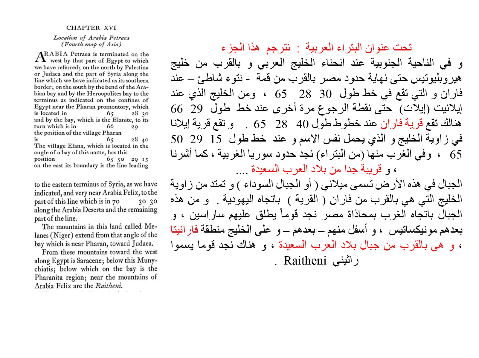 مما دفعني لأكتب هذا ، ما وجدته مدوناً عند أحد اشهر الجغرافيين الاغريق و هو بطلميوس كلاوديوس من القرن الاول الميلادي ، الذي فصل فاران إلى منطقتين احدهما قرية صغيرة تقع في جوف شبه جزيرة سيناء عند اتقاء فرعي البحر الاحمر ، من الداخل طبعا تقع قرية تسمى فاران و اشار مرة اخرى الى منطقة يطلق عليها فارنيتا ( أو فاران ) و هي ملاصقة لبلاد العرب السعيدة و يجدر الاشارة ان بلاد العرب السعيدة تشير الى اليمن او تلك المنطقة الجنوبية من الجزيرة العربية ، بينما فارانيتا هي مجموعة جبال الحجاز حيث يقع الحجر و المدينة و مكة ، جنوب الجزيرة العربية بمحاذاة البحر الأحمر . كما وثقت كلامي بخريطة قديمة ظهر فيها اسم فارنيتا المشار إليها ، و لن يدعي مدعي بعد ذلك أن المقصود هو تلك القرية الصغيرة ، بعد أن فصلها لنا عالم من اشهر علماء جغرافيا العالم القديم ...... و هذه صورة من جوجل ايرث للتوضيح http://www.kalemasawaa.com/vb/attach...1&d=1362871120 و يقول بليني الأكبر ، الجغرافي الذي عاش في القرن الأول الميلادي و الذي توفى عام 79 ميلادية ، في اقتباس من كتابه الشهير ، التاريخ الطبيعي أو علم الأحياء : " being identical with "pharanitis," so called from a country4 on the frontiers of Arabia that produces it. " " و هو متماثل تماماً مع (أحجار) فارانتيس (فاران) ، هكذا يسمى حيث يعزو هذا الإسم إلى بلد تقع على حدود بلاد العرب و هي التي تنتجه " . انتهى كلامه ، في سياق كلامه عن الأحجار الكريمة الزرقاء و الملونة و بالطبع لن يشير هنا إلى قرية فاران التي تقع عند زاوية شبه جزيرة سيناء و بالتأكيد يتكلم عن بلاد العرب الشمالية و هي الحجر و الحجاز و مكة و عسير .... لأنها اشتهرت بالتجارة منذ القدم ... للدخول لموقع بليني الاكبر : http://www.perseus.tufts.edu/hopper/...ghlight=pharan http://www.kalemasawaa.com/vb/attach...1&d=1362871029 بطلميوس كلاديوس – عالم الجغرافيا الاغريقي تقول عنه الويكيبيديا كلاوديوس بتوليمايوس (ما بعد 83 حتى – 161 بعد الميلاد بالاتينية "κλαύδιος πτολεμα ῖ ος"، المعروف بالاسم "بطليموس" وأيضا بالاسم "الحكيم بطليموس"، عالم رياضيات اغريقيه ، وجغرافية، وعالم فلك ومنجم. لاتوجد معلومات عن خلفية عائلته، فيما ترجح مصادر أخرى أنه من إغريقيي مصر في حين يرجح آخرون أنه كان إغريقيا من اليونان ، في حين أن رسالة عثر عليها بالعربية تصفه بالصعيدي المصري في إشارة إلي أن أصوله تعود إلي جنوبي مصر ، توفي في الأسكندرية العام 161 م. و خريطة قديمة تضع فارانيتا (فاران) في أول الجزيرة العربية ناحية الشمال و شكرا للمتابعة و السلام عليكم ورحمة الله http://www.kalemasawaa.com/vb/attach...1&d=1362871328 |