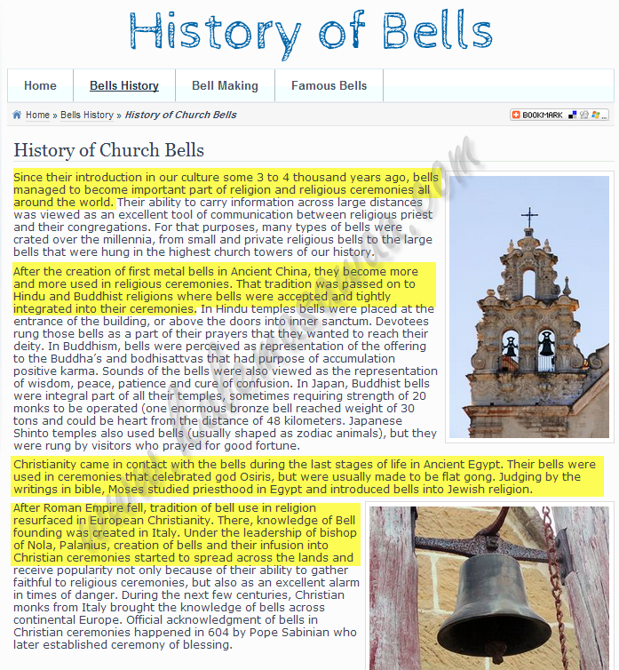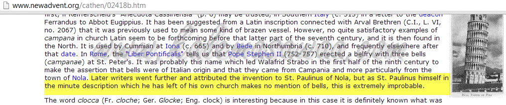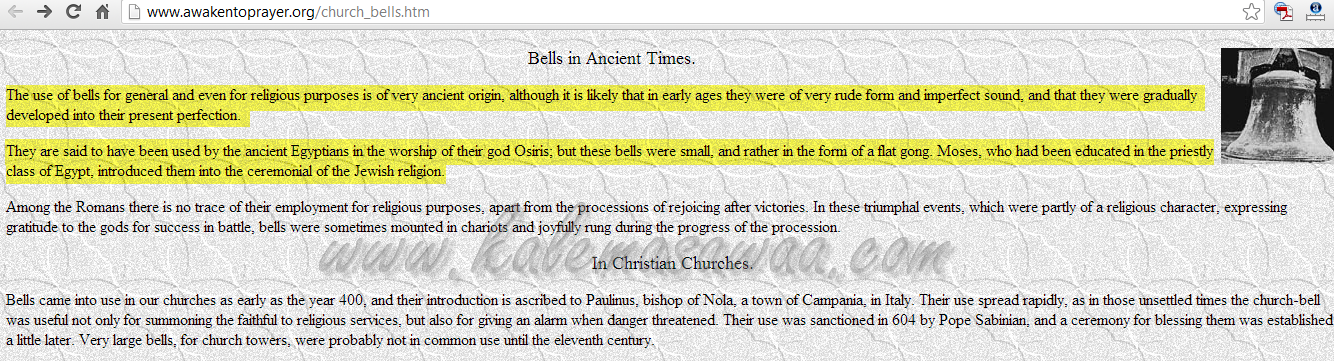 تذكر الموسوعة الكاثوليكية أن الكُتاب المتأخرين لعهد القديس باولينوس ذكروا انه أول من استخدم الجرس في الكنائس .. ثم تذكر أن القديس باولينوس لم يذكر في وصفه الدقيق لما ترك لكنيسته شيئًا عن الأجراس http://www.kalemasawaa.com/vb/attach...1&d=1364667007 http://www.newadvent.org/cathen/02418b.htm _______________ أما هذا الموقع الكاثوليكي فيذكر أن استعمال الأجراس في المناسبات الدينية يعود للعصور القديمة جدًا وأنها كانت تستخدم في عبادة أوزريس لدى المصريين القدماء http://www.kalemasawaa.com/vb/attach...1&d=1364667048 http://www.awakentoprayer.org/church_bells.htm ______________ أما هذا الموقع المختص بتاريخ الأجراس .. يذكر أنه تم استخدام الأجراس في المناسبات الدينية الهندوسية والبوذية وفي عبادة أوزريس لدى المصريين القدماء .. وأنه ظهر في النصرانية بعد انهيار الإمبراطورية الرومانية http://www.kalemasawaa.com/vb/attach...1&d=1364667048 http://www.historyofbells.com/bells-...-church-bells/ ________________ الأجراس تدق في احتفالات بداية العام اليابانية البوذية http://www.kalemasawaa.com/vb/attach...1&d=1364668264 http://www.buddhistchannel.tv/index....5,5649,0,0,1,0 _______________ دق الأجراس في الاحتفالات البوذية في المعابد http://www.youtube.com/watch?v=9601DwJAynA فأصل استخدام الأجراس في النصرانية يعود لجذور وثنية |
