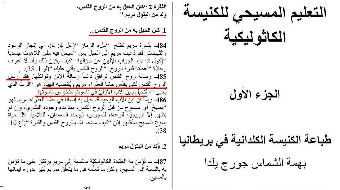 السائل فى الرسالة السابقة عايز يبقى كاثوليكى هو وزوجته لكن الحاجة الوحيدة الي واقفت معاهم هو زواج الروح القدس مِن العذراء مش مذكور فى الكتاب المقدس ولا عند الأباء فى و قت مبكر قال يعنى مذكور تجسد اللاهوت فى الناسوت أو إلوهية المسيح أو الثالوث |