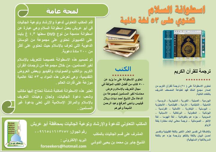 http://www.kalemasawaa.com/vb/attach...1&d=1393651566 http://www.kalemasawaa.com/vb/attach...1&d=1393651566 لمحة عامة قام المكتب التعاوني لدعوة والأرشاد وتوعية الجاليات في أبوعريش بعمل اسطوانة السلام وهي عبارة عن اسطوانة مدمجة من نوع DVD سعتها 4.3 غ بايت على الكمبيوتر تحتوي على مجموعة من الوسائل الدعوية التي تعرف بالإسلام حيث تحتوي على أكثر من 700 مادة دعوية. تم تصميم هذه الاسطوانة خصيصا للتعريف بالإسلام لغير المسلمين ، من خلال مجموعة من ترجمات القرآن الكريم ،والكتب والصوتيات والفيديو وبعض العروض التقديمية، وهي تعرض هذه المواد بـ 53 لغة عالمية موزعة على قارات العالم . تعتبر هذه الاسطوانة كمكتبة شاملة تحتاج إليها مكاتب وشعب دعوة الجاليات ،ولجان وهيئات التعريف بالإسلام والمراكز الإسلامية التي تعنى بدعوة غير المسلمين . http://www.youtube.com/watch?v=5zi0SBwqTuo بعض الأسباب التي دعت لتصميم هذه الأسطوانة 1- عدم معرفة كثير من الدعاة والعاملين في مجال دعوة غير المسلمين بالمادة المناسبة التي يمكن من خلالها عرض الإسلام بصورة صحيحة ، وذلك لكثرة العناوين والمواد المطروحة على الساحة. 2- ندرة المواد التي تعرف بالإسلام ببعض اللغات المتداولة . الأهداف 1- التعريف بالإسلام بالصورة الصحيحة. 2- دعوة غير المسلمين في جميع أنحاء العالم بلغاتهم التي يتكلمونها. 3- توفير مادة دعوية للمراكز الإسلامية وسد العجز الذي يمكن أن يحدث في بعض الوسائل الأخرى كالكتب. 4- تمكين الجميع من الدعوة إلى الله وذلك من خلال توفير مادة جاهزة توافق لغة المستهدف يمكن تقديمها إليه. لغة ألاسطوانة تعرض الاسطوانة الوسائل الدعوية بـ53 لغة عالمية وفيما يلي شرح لهذه اللغات من خلال بعض الأشكال التي توضح قوائم اللغات في الاسطوانة: قائمة اللغات الرئيسية آسيا – أوروبا - أفريقيا http://www.kalemasawaa.com/vb/attach...1&d=1393651566 قائمة لغات آسيا 1- البورمية 2- الصينية 3- العبرية 4- الهندية 5- اليابانية 6- الكورية 7- الماليالية - ماليزيا 8- الماليبارية - الهند 9- النيبالية 10- الروسبة 11- السنهالية سريلانكا 12- التقالوق - الفلبين 13- التاميلية - الهند 14- التشامية 15- التلقو - الهند 16- التايلندية 17- الاردية 18- الفيتنامية قائمة لغات أوروبا http://www.kalemasawaa.com/vb/attach...1&d=1393651566 1- الالبانيية 2- البوسنية 3- البلغارية 4- التشيكية 5- الدنمركية 6- الألمانية 7- الانجليزية 8- الفنلندية 9- الفرنسية 10- اليونانية 11- الهنغارية 12- الايطالية 13- المقدونية 14- الهولندية 15- النرويجية 16- البولندية 17- البرتغالية 18- الرومانية 19- السلوفية 20- الاسبانية 21- السويدية 22- الأوكرانية قائمة اللغات الأفريقية http://www.kalemasawaa.com/vb/attach...1&d=1393651566 1- الامهرية - اثيوبيا 2- الاشنتية –غرب افريقيا 3- القمرية 4- الفلاتية 5- الفولانية 6- الهوسا- نيجيريا 7- المدغشقرية 8- الانكو 9- الصومالية 10- السواحيلية - كينيا 11- التجرينية – اثيوبيا وأريتريا 12- اليوربا 13- الزولو- جنوب أفريقيا القرآن الكريم تحتوي الأسطوانة على ( 24) ترجمة للقرآن الكريم من إصدار مجمع الملك فهد لطباعة المصحف الشريف باللغات التالية: البورمية – الصينية – الكورية – المليبارية – الروسية – التاميلية – التايلندية – الأردية – الفيتنامية – الانجليزية – البوسنية – البلغارية – الألمانية – الفرنسية – اليونانية – المقدونية – البرتغالية – الأسبانية – السويدية – جزء عم بالفولانية – لغة الهوسا – لغة الإنكو – الصومالية – ترجمة معاني آيات مختارة بلغة الزولو بالإضافة إلى تفسير العشر الأخير باللغة الفلبينية وتفسير أحسن البيان باللغة بالتلغو وترجمة جزء عم باللغة السريلانكية ( السنهالية) الكتب تحتوي الأسطوانة على ما يزيد عن 500 كتاب من أفضل الكتب المؤلفة في مجال التعريف بالإسلام وعرض محاسنه لغير المسلمين لمجموعة من الدعاة مثل الشيخ أحمد ديدات وبلال فيليبس وناجي العرفج وعبد الرحمن الشيحة وغيرهم الصوتيات توجد مجموعة مختارة من المحاضرات والخطب التي تتحدث عن مواضيع مهمة كمفهوم الخلاص ومكانة المرأة في الإسلام والهدف من الحياة وطرق السعادة الحقي