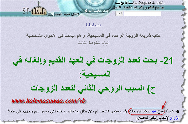 تمّ الردّ على هذه النقطة ، معبودكَ سمح بالتعدد ( كما أفادت بذلك المواقع النصرانية ) نرجو من المنصّر ان يضع نصب عينيه كون يهوه القدير قد بارك ثمار تلكَ الزيجات ( مباركة إسماعيل عليه السلام مثلا ) . اقتباس: