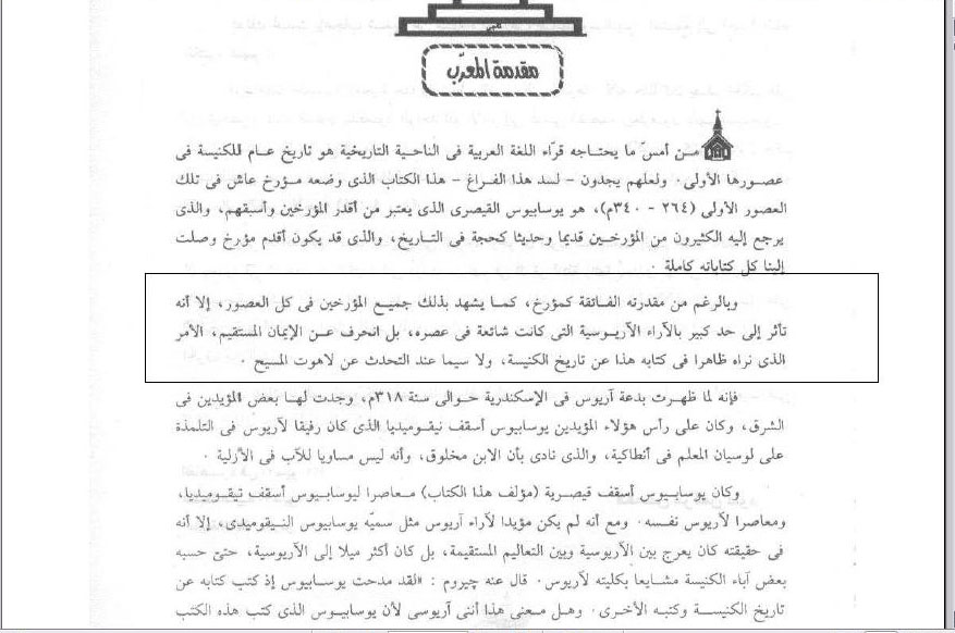 ان يوسابيوس انكر رسالة بطرس الثانية ... تاريخ الكنيسة كتاب 3 فصل 3 http://www.ebnmaryam.com/vb/attachme...1&d=1259830803 وايضا أنكر رؤيا يوحنا اللاهوتى ...!!! دائرة المعارف الكتابية ... http://www.ebnmaryam.com/vb/attachme...1&d=1259830803 والطامة الكبرى والحقيقة المؤلمة التى يجب ان يعملها اصدقائنا النصارى ان ابو التاريخ الكنسى كان اريوسى .!!!!!! نعم هذا ما ذكرة المعرب القمص مرقس داود فى مقدمة تاريخ الكنيسة http://www.ebnmaryam.com/vb/attachme...1&d=1259830803 وايضا فى سير القديسين http://www.ebnmaryam.com/vb/attachme...1&d=1261269360 هل وصل الافلاس لدرجة ان نستشهد بكلام اريوس المهرطق ...!!!!! يُتبع ... |