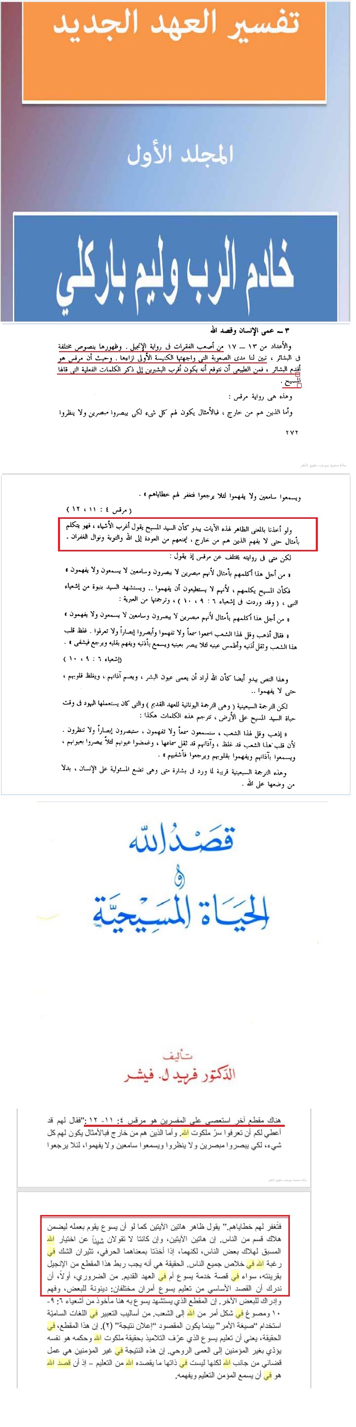بسم الله الرحمن الرحيم و به نستعين إنجيل مرقس 4 1 وَابْتَدَأَ أَيْضًا يُعَلِّمُ عِنْدَ الْبَحْرِ، فَاجْتَمَعَ إِلَيْهِ جَمْعٌ كَثِيرٌ حَتَّى إِنَّهُ دَخَلَ السَّفِينَةَ وَجَلَسَ عَلَى الْبَحْرِ، وَالْجَمْعُ كُلُّهُ كَانَ عِنْدَ الْبَحْرِ عَلَى الأَرْضِ. 2 فَكَانَ يُعَلِّمُهُمْ كَثِيرًا بِأَمْثَال. وَقَالَ لَهُمْ فِي تَعْلِيمِهِ: «اسْمَعُوا! هُوَذَا الزَّارِعُ قَدْ خَرَجَ لِيَزْرَعَ، 4 وَفِيمَا هُوَ يَزْرَعُ سَقَطَ بَعْضٌ عَلَى الطَّرِيقِ، فَجَاءَتْ طُيُورُ السَّمَاءِ وَأَكَلَتْهُ. 5 وَسَقَطَ آخَرُ عَلَى مَكَانٍ مُحْجِرٍ، حَيْثُ لَمْ تَكُنْ لَهُ تُرْبَةٌ كَثِيرَةٌ، فَنَبَتَ حَالًا إِذْ لَمْ يَكُنْ لَهُ عُمْقُ أَرْضٍ. 6 وَلكِنْ لَمَّا أَشْرَقَتِ الشَّمْسُ احْتَرَقَ، وَإِذْ لَمْ يَكُنْ لَهُ أَصْلٌ جَفَّ. 7 وَسَقَطَ آخَرُ فِي الشَّوْكِ، فَطَلَعَ الشَّوْكُ وَخَنَقَهُ فَلَمْ يُعْطِ ثَمَرًا. 8 وَسَقَطَ آخَرُ فِي الأَرْضِ الْجَيِّدَةِ، فَأَعْطَى ثَمَرًا يَصْعَدُ وَيَنْمُو، فَأَتَى وَاحِدٌ بِثَلاَثِينَ وَآخَرُ بِسِتِّينَ وَآخَرُ بِمِئَةٍ». 9 ثُمَّ قَالَ لَهُمْ: «مَنْ لَهُ أُذُنَانِ لِلسَّمْعِ، فَلْيَسْمَعْ» 10 وَلَمَّا كَانَ وَحْدَهُ سَأَلَهُ الَّذِينَ حَوْلَهُ مَعَ الاثْنَيْ عَشَرَ عَنِ الْمَثَلِ، 11 فَقَالَ لَهُمْ: «قَدْ أُعْطِيَ لَكُمْ أَنْ تَعْرِفُوا سِرَّ مَلَكُوتِ اللهِ. وَأَمَّا الَّذِينَ هُمْ مِنْ خَارِجٍ فَبِالأَمْثَالِ يَكُونُ لَهُمْ كُلُّ شَيْءٍ، 12 لِكَيْ يُبْصِرُوا مُبْصِرِينَ وَلاَ يَنْظُرُوا، وَيَسْمَعُوا سَامِعِينَ وَلاَ يَفْهَمُوا، لِئَلاَّ يَرْجِعُوا فَتُغْفَرَ لَهُمْ خَطَايَاهُمْ». 13 ثُمَّ قَالَ لَهُمْ: «أَمَا تَعْلَمُونَ هذَا الْمَثَلَ؟ فَكَيْفَ تَعْرِفُونَ جَمِيعَ الأَمْثَالِ؟ وجاء في تفسير تادرس يعقوب مالطي هذا التسائل سادسًا: في لقاء الاثني عشر مع السيد، إذ سألوه عن المثل أجاب: "قد أُعطى لكم أن تعرفوا سرّ ملكوت الله، وأما الذين هم من خارج فبالأمثال يكون لهم كل شيء. لكي يبصروا مبصرين ولا ينظروا، ويسمعوا سامعين ولا يفهموا، لئلا يرجعوا، فتغفر لهم خطاياهم" [11-12]. وقد أثارت هذه الإجابة تساؤلات الكثير من الدارسين: كيف يكون هذا؟ ألا يريد السيد من البشرية أن تفهم تعليمه وتتمتع بخلاصه، وتنال غفران الخطايا؟ وجاء أيضاً عن هذا النص https://www.kalemasawaa.com/vb/attac...1&d=1550598552 https://www.kalemasawaa.com/vb/attac...9&d=1550312304 https://www.kalemasawaa.com/vb/attac...1&d=1550334755 https://www.kalemasawaa.com/vb/attac...1&d=1550334978 مرقس 4 ترجمة الفاندايك 12 لِكَيْ يُبْصِرُوا مُبْصِرِينَ وَلاَ يَنْظُرُوا، وَيَسْمَعُوا سَامِعِينَ وَلاَ يَفْهَمُوا، لِئَلاَّ يَرْجِعُوا فَتُغْفَرَ لَهُمْ خَطَايَاهُمْ». مرقس 4 الترجمة الكاثوليكية غاية يسوع من الأمثال مر 4-10: فلَمَّا اعتَزَلَ الجَمْع، سأَلَه الَّذينَ حَولَه معَ الاثْنَي عَشَرَ عنِ الأَمثال. مر 4-11:فقالَ لَهم: ((أَنتُم أُعطيتُم سِرَّ مَلكوتِ الله. وأَمَّا سائرُ النَّاس فكُلُّ شَيءٍ يُلقى إِلَيهِم بِالأَمثال مر 4-12:فيَنظُرونَ نَظَراً ولا يُبصِرون ويَسمَعونَ سَماعاً ولا يَفهَمون لِئَلاَّ يَرجِعوا فَيُغفَرَ لَهم)). مرقس 4 الترجمة العربية المشتركة مغزى الأمثال مر 4-10:فلمَّا كانَ على اَنفِرادٍ، سألَهُ أتباعُهُ والرُّسُلُ الإثنا عشَرَ عَنْ مَغزى الأمثالِ، مر 4-11:فقالَ لهُم: ((أنتُم أُعطِيتُم سرَّ مَلكوتِ اللهِ. وأمَّا الّذينَ مِنْ خارِجٍ فيَسمَعونَ كُلَّ شيءٍ بالأمثالِ، مر 4-12:حتّى إنَّهُم: مَهما نَظَروا لا يُبصِرونَ،ومَهما سَمِعوا لا يَفهَمونَ ، لئلاَّ يَتوبوا فتُغفَرَ لهُم خطاياهُم )). مرقس 4 الترجمة البولسية مر 4-10:ولمَّا انْفردَ سأَلَهُ الذَّينَ حَوْلَهُ، مَعَ الاثَنْي عَشَرَ، عَنِ الأَمثال. مر 4-11:فَقالَ لَهم: "أَنْتم قد أُوتيتُم أَنْ تَعْرِفوا سِرَّ مَلكوتِ اللهِ. وأَمَّا أُولئكَ، الذَّينَ في الخارجِ فكلُّ شَيءٍ لهم بأَمْثال. مر 4-12:لكَيْ يَنْظُروا نَظَر