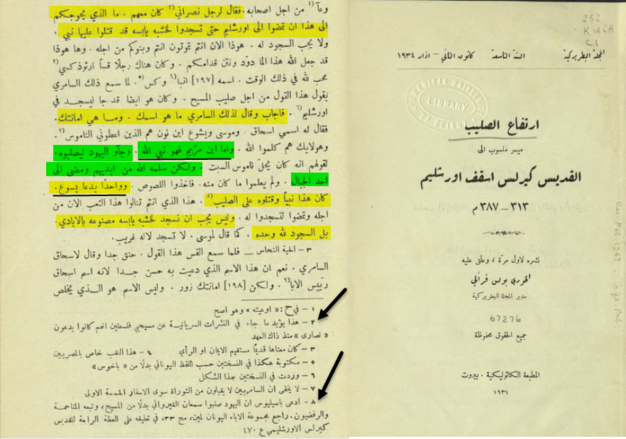 [ابن مريم النبي الذي نجاه الله] [ واحد يدعا يسوع الذي صلب] ينقل كيرلس الاورشليمي * القرن الرابع * في كتابه النادر (ارتفاع الصليب) حوار حدث في * القرن الثاني * بين اليهودي السامري إسحاق والقس الارزوذكسي اوخيدس [[[ يقول إسحاق السامري : ما الذي يحوجكم الي أن تمضوا الي أورشليم حتى تسجدوا لخشبة يابسه قد قتلوا عليها نبي. موسي ويشوع ابن نون هم الذين اعطوني الناموس وهؤلاء هم كلموا الله.. وأما ابن مريم فهو نبي الله جأو اليهود ليلصبوه لقولهم انه يحل ناموس السبت ولكن الله سلمه من ايديهم ومضى الي احد الجبال، ولم يعلموا ما كان منه.. وواحد يدعا يسوع كان هذا نبيا وقتلوه على الصليب]]] قولت = الي القرن الثانى يوجد رجلان عند اليهود والنصارى ابن مريم نبي الله حاول اليهود صلبه لكن الله نجاه منهم.. وواحد يدعا يسوع هو نبي أيضا ولكنه صلب على الصليب = هذة القصه تنقلها كتب السنكسار القبطي سواء القديمه أو الجديدة وكل هذة الكتب تتحدث عن مسألة اكتشاف الصليب وتنقل هذة القصه عن كيرلس الاورشليمي صاحب كتاب ارتفاع الصليب ولكن تحرف وتحذف هذه الجزئية الهامة، والسبب معروف! = في القرن الثاني ابن مريم نبي وواحد يدعا يسوع أيضا نبي، لاحظ الفرق [ ابن مريم النبي / واحد يدعا يسوع] |