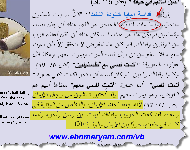 يقول " قداسة البابا شنودة الثالث": "كلاَّ. لم يمت شمشون منتحرًا، وإنما مات فدائياً، فالمنتحر هو الذي هدفه أن يقتل نفسه، وشمشون لم يكن هذا هو هدفه، إنما كان هدفه أن يقتل أعداء الرب من الوثنيين وقتذاك. فلو كان هذا الغرض لا يتحقق إلاَّ بأن يموت معهم، فلا مانع من أن يبذل نفسه للموت ويموت معهم. وهكذا قال عبارته المعروفة " لتمت نفسي مع الفلسطينيين" (قض 16: 30).. وكانوا وقتذاك وثنيين.. لو كان قصده أن ينتحر لكانت تكفي عبارة "لتمت نفسي".. أما عبارة "لتمت نفسي معهم" معناها أنهم هم الغرض، وهو يموت معهم. ولقد أُعتبر شمشون من رجال الإيمان (عب 11: 32) لأنه جاهد لحفظ الإيمان، بالتخلص من الوثنية في زمانه، فقد كانت الحروب وقتذاك ليست بين وطن وآخر، وإنما كانت في حقيقتها حربًا بين الإيمان والوثنية"(3).