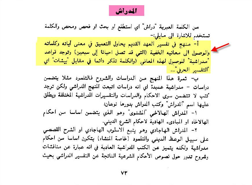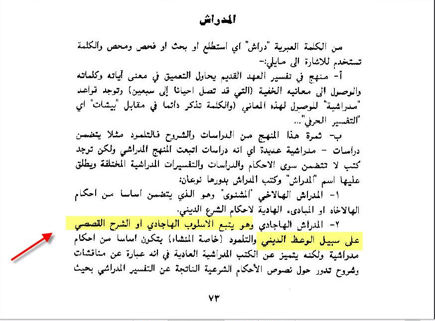 تعريف المدراش .... المدراش كما يعرفه المحيط الجامع هى تفسير الرابينيين ( الحاخامات ) للتوراة لإيضاح النقاط القانونيّة لتقديم تعليم أخلاقي مستعينين بالأخبار والامثال والروايات ...... http://www.albishara.org/dictionary....cc509a6f75849b ويقول غازى السعدى فى كتاب - الأعياد والمناسبات والطقوس لدى اليهود - 73 انها منهج الأحبار فى تفسير العهد القديم حيث يتم التدقيق فى الكلام للوصول الى معنى النص وما يخفية .... http://www.ebnmaryam.com/vb/attachme...1&d=1241177307 http://www.ebnmaryam.com/vb/attachme...1&d=1241177307 ويقول الدكتور ايميل ماهر - الكتاب المقدس وفق تفسير الاباء القديم .. انة نشاظ الربابنة فى تفسير الايات واستخراج المعانى العميقة منها http://www.ebnmaryam.com/vb/attachme...1&d=1271936557 http://www.ebnmaryam.com/vb/attachme...1&d=1241177777 وتقول الموسوعة الكاثوليكية .... The term commonly designates ancient rabbinical commentaries on the Hebrew Scriptures مصطلح يشير عادة الى التفاسير القديمة للكتب العبرية ... http://www.newadvent.org/cathen/10286b.htm ويقول david stern ان المدراش التفاسير الأقدم للكتاب المقدس .... http://www.ebnmaryam.com/vb/attachme...1&d=1241177777 http://www.ebnmaryam.com/vb/attachme...1&d=1271936557 وتحاول المدراش تفسير وتحليل التناخ ( اسم الكتاب المقدس عند اليهود - العهد القديم عند النصارى ) وتستخرج المعانى العميقة للنصوص .... Midrash attempts, through minute examination and interpretation of the Tanach, to bring out the deeper or ethical meaning of the text. http://www.yashanet.com/studies/juda...rs/midrash.htm تنقسم المدراش كما بينت المصادر أعلاة الى قسمين .... 1- مدراش هلكه .........Midrash Halachah 2- مدراش هاغاده ......Midrash Aggadah http://www.albishara.org/dictionary....cc509a6f75849b There are two main types of Midrash - Midrash Aggadah and Midrash Halachah The two basic types of midrash are known as Midrash Aggadah, regarding the ethical or spiritual exposition of a text, and Midrash Halakhah, referring to the exegesis of biblically-related Jewish law A third category of rabbinic literature is midrash, of which there are two types. Midrash aggada derive the sermonic implications from the biblical text; Midrash halakha derive laws from it. The Midrashic works can be divided into two classes: The Halachic Midrash and the Non-Halachic Midrash. A Halachic Midrash is one that deals with legal material, while a non-halachic Midrash deals with moral or theological issues http://www.judaismsanswer.com/midrash.htm مدراش هلكه .........Midrash Halachah يتكلم عن الأمور التى تختص بالشريعة ويوضح تفاصيلها .... اما الهاجادا ........ هيكون كلامنا عليها ان شاء الله ... |