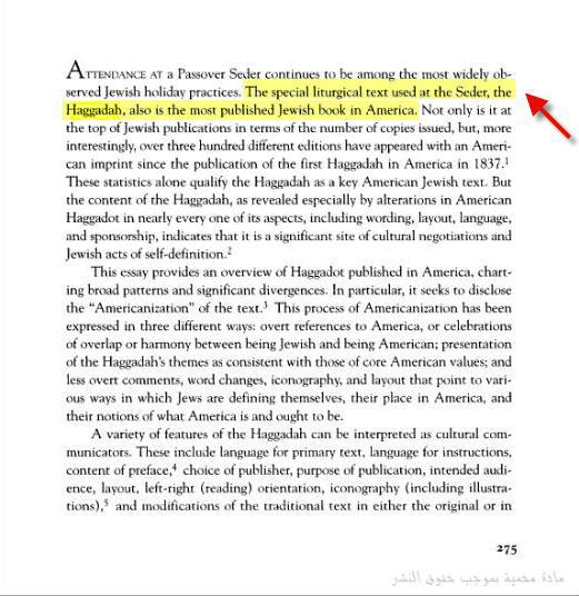 THE HAGGADAH ( الهاغادة ) تعريفها ومحتوياتها .. ......... الهاجادا تتناول الشرح القصصى لنصوص العهد القديم .....بمعنى انها تحاول تفسير النصوص باستخدام القصص والمواعظ ........... او تتعلق بالمواضيع الاخرى غير التشريعية التى لا يتعرض لها مدراش هلكة Midrash Haggadah embraces the interpretation, illustration, or expansion, in a moralizing or edifying manner, of the non-legal portions of the Bible http://www.jewishencyclopedia.com/vi...d=587&letter=M ما هى محتويات الهاجادا ؟؟؟؟ يقول لنا الجهبذ علامة زمانة .......... http://www.ebnmaryam.com/vb/mistysty.../quotes/14.gif اقتباس http://www.ebnmaryam.com/vb/mistysty.../quotes/11.gif http://www.ebnmaryam.com/vb/mistysty...c/quotes/1.gif هذا البحث يوضح التطابق الشديد بين ايات القران وكتاب الهاجادا اليهودي الاسطوري http://www.ebnmaryam.com/vb/mistysty...c/quotes/4.gif http://www.ebnmaryam.com/vb/mistysty...c/quotes/6.gif http://www.ebnmaryam.com/vb/mistysty.../quotes/14.gif اقتباس http://www.ebnmaryam.com/vb/mistysty.../quotes/11.gif http://www.ebnmaryam.com/vb/mistysty...c/quotes/1.gif هذه الاساطير كانت موجودة في كتاب الهاجادا ( The Haggadah ????) اليهودي الذي يضم خرافات واساطير اليهود http://www.ebnmaryam.com/vb/mistysty...c/quotes/4.gif http://www.ebnmaryam.com/vb/mistysty...c/quotes/6.gif أعلم ورب الكعبة .... ان الجهل نسب فى الأنسان وأعلم ايضا ان الله ذكر لنا فى القران ان هناك مخلوقات لا نعلمها .... ولكن لم اتخيل فى يوم من الايام ان أرى جهل بهذا الكيفية هو يقول ان الهاجادا كتاب اسطورى ولا يوجد منة شئ فى التوراه ...؟؟؟!! طيب نشوف ............... جاء فى المحيط الجامع والمدراش ها غاده ينطلق من مواعظ كانت تُسمع في المجامع. هي أخبار مواعظيّة واخبار تبني الجماعة لاستخلاص تعاليم اخلاقيّة من التوراة. http://www.albishara.org/dictionary....cc509a6f75849b ويقول القس ايميل ماهر - الكتاب المُقدس اسلوب تفسيرة السليم - صفحة 15 http://www.ebnmaryam.com/vb/attachme...1&d=1271937706 The New Jewish encyclopedia- By David Bridger, Samuel Wolk - pg 183 http://www.ebnmaryam.com/vb/attachme...1&d=1271938408 in the hands of the child - 12 http://www.ebnmaryam.com/vb/attachme...1&d=1271938408 http://www.ebnmaryam.com/vb/attachme...1&d=1271938408 An introductory dictionary of theology and religious studies- By Orlando O, James B. Nickoloff- pg 531 http://www.ebnmaryam.com/vb/attachme...1&d=1271938131 http://www.ebnmaryam.com/vb/attachme...1&d=1271938131 Dictionary of Jewish words - Joyce Eisenberg - 56 http://www.ebnmaryam.com/vb/attachme...1&d=1271938566 http://www.ebnmaryam.com/vb/attachme...1&d=1271938566 The Haggadah contains prayers, readings from the Torah, instructions for the Seder, old and new commentary on the Exodus, and sometimes songs. http://www.wisegeek.com/what-is-the-haggadah.htm The traditional Haggadah offers a set of instructions for conducting the Passover service, interspersed with readings from the Bible, rabbinical commentaries, legends, prayers, hymns and children's songs http://haggadahs.tripod.com/women.htm The Haggadah contains prayers, readings from the Torah (the Old Testament), songs and commentary about the story. http://www.education.com/activity/ar...gadah_Scrolls/ The traditional Haggadah, which contains prayers, readings from the Torah, old and new commentary on the Exodus, and sometimes songs, can take more than an hour http://articles.chicagotribune.com/2...ah-adaptations Midrash Aggadah is the most common and contains stories and legends, concerned with ethical teachings or other topical issues. Haggadah (or Aggadah) - Storytelling, like parables or midrash (see entry below). Explaining the Bible and theology using story. Often contrasted with halakah, legal rulings (below). Also, in the Passover Seder, each person traditionally has a book with the story of Passover, plus songs and prayers called a Haggadah. http://www.egrc.net/pages/glossary.html Haggadah is the holy script of the Jews, which gives a detailed description of the different rituals that have to be observed during the Passover Seder, in a stepwise manner. A total of 15 steps have been structured in the book and the reading of each of these steps is considered as a spiritual commandment and directive for every Jew. In addition to the explanation of the Seder rituals, Haggadah also contains Biblical passages, prayers, hymns, blessings, benedictions, stories, dialogues and even rabbinic literature http://festivals.iloveindia.com/passover/haggadah.html اذا محتويات الهاجادا ... قراءات من التوراه ..... (readings from the Torah) وصلوات (prayers)............. وأغانى (prayers) .....وقصص ..( stories ) وقصص عن خروج بنى اسرائيل من مصر ......... (Exodus) وتفاسير وتعليقات الربابنة ( rabbinical commentaries ) ومزامير وتراتيل ( hymns ,pslams ) واساطير.....(legends ) اذا فهذا الكتاب مثلة ... مثل ما يسمية النصارى العهد القديم .....يحتوى على كل شئ وفية حكايات وقصص وخرافات وصلوات واغانى وقصائد ....... ........ وهو نفس الوصف الذى وصف بية جوستاف لوبون المؤرخ الفرنسى .. العهد القديم اليهود فى تاريخ الحضارات الأولى - صفحة 106 http://www.ebnmaryam.com/vb/attachme...1&d=1271941585 http://www.eb
