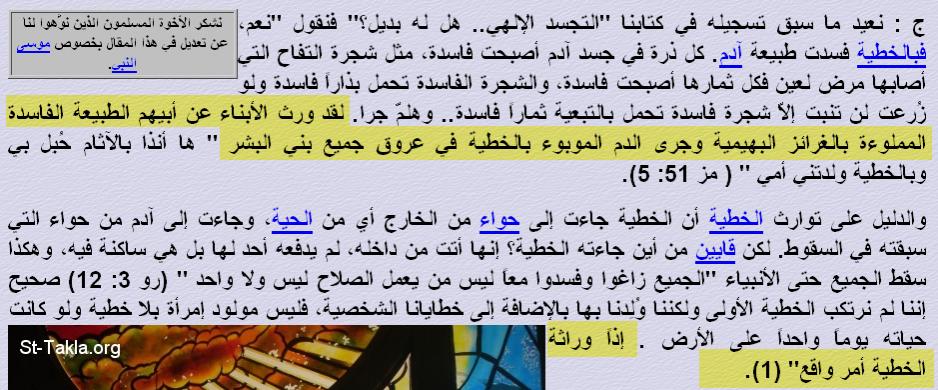 من كتاب ( حتمية التجسد الإلهى ) http://www.kalemasawaa.com/vb/attach...1&d=1278974074 http://www.kalemasawaa.com/vb/attach...1&d=1278974177 هذا كان عقاب يهوه لأدم بعد الأكل من الشجرة تك 2 : 17 وَأَمَّا شَجَرَةُ مَعْرِفَةِ الْخَيْرِ وَالشَّرِّ فَلاَ تَأْكُلْ مِنْهَا، لأَنَّكَ يَوْمَ تَأْكُلُ مِنْهَا مَوْتًا تَمُوتُ تك 3 : 17 وَقَالَ لآدَمَ: لأَنَّكَ سَمِعْتَ لِقَوْلِ امْرَأَتِكَ وَأَكَلْتَ مِنَ الشَّجَرَةِ الَّتِي أَوْصَيْتُكَ قَائِلاً: لاَ تَأْكُلْ مِنْهَا، مَلْعُونَةٌ الأَرْضُ بِسَبَبِكَ. بِالتَّعَبِ تَأْكُلُ مِنْهَا كُلَّ أَيَّامِ حَيَاتِكَ و بسهولة نثبت أن يهوه رفع العقوبة تك 8 : 21 فَتَنَسَّمَ الرَّبُّ رَائِحَةَ الرِّضَا. وَقَالَ الرَّبُّ فِي قَلْبِهِ: لاَ أَعُودُ أَلْعَنُ الأَرْضَ أَيْضًا مِنْ أَجْلِ الإِنْسَانِ، لأَنَّ تَصَوُّرَ قَلْبِ الإِنْسَانِ شِرِّيرٌ مُنْذُ حَدَاثَتِهِ. وَلاَ أَعُودُ أَيْضًا أُمِيتُ كُلَّ حَيٍّ كَمَا فَعَلْتُ اقتباس:
