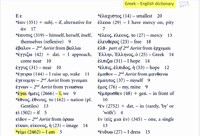 علاقة ايجو ايمى بأهيه ويهوه ........... ندخل شوية فى النص ونشوف أصل الكلمة التى قالها يسوع ... وهل فعلا تساوى اهية .. وما هو معناها الحقيقى ..... GNT) εἶπεν αὐτοῖς ᾿Ιησοῦς· ἀμὴν ἀμὴν λέγω ὑμῖν, πρὶν ᾿Αβραὰμ γενέσθαι ἐγὼ εἰμί. (KJV) Jesus said unto them, Verily, verily, I say unto you, Before Abraham was, I am. 8: 58 قال لهم يسوع الحق الحق اقول لكم قبل ان يكون ابراهيم انا كائن ἐγὼ εἰμί - ايجو ايمى - I am الكلمة بكل بساطة تعنى أنا أكون ... ( ايجو = أنا ) ...( ايمى = أكون ) لنذهب الى الفهرس العربى لكلمات العهد الجديد اليونانية .... http://www.ebnmaryam.com/vb/attachme...1&d=1278625846 http://www.ebnmaryam.com/vb/attachme...1&d=1278625846 http://www.ebnmaryam.com/vb/attachme...1&d=1278625846 ونذهب ايضا الى ... The elements of New Testament Greek By Jeremy Duff, David Wenham اذا فالكلمة فى أصلها اليونانى ... ليس لها اى قدسية .. ولا يوجد مرجع مسيحى ابداا يقول ان ايجو ايمى من أسماء الله فى اللغة اليونانية ... ولكن كما رأينا ان القدسية الذى أعطاها بعض أهل الكتاب لهذة الكلمة ...انهم زعموا انها تساوى اهيه بالعبرية ... وبتالى من قال ايجو ايمى باليونانية ... مثل من قال اهيه بالعبرية .. ومن قال اهيه فهو يهوه ...كما رأينا من خلال كلامهم .... وقد أثبتنا بفضل الله ان ربط يهوه بأهية مجرد نظرية من ضمن النظريات ... وقد أثبتنا ايضا ان أهيه ليس لها اى قدسية فى العهد القديم ويمكن ان يقولها اى شخص ...... والان لنبحث عن ربط ايجو ايمى بأهية ..... هل من قال ايجو ايمى باليونانية ....مثل من قال أهية بالعبرية ؟؟؟ كما رأينا فى المشاركة السابقة ... ان ترجمات عبارة اهية الذى اهية كثيرة ومختلفة ... ولذلك سنذهب الان الى الترجمة السبعينية ... فهذة الترجمة ليست كأى ترجمة اخرى ... فقد نالت هذة الترجمة مكانة كبيرة جدااا بين علماء النصارى ...وقد أعتقد كثير من الاباء ان هذة الترجمة وحى من الله .... بل تعتبر هذة الترجمة هى النص الرسمى للعهد القديم عند الكنيسة الارثوذكسية ..... فكرة عامة عن الكتاب المُقدس - دير الانبا مقار http://www.ebnmaryam.com/vb/attachme...5&d=1271932294 http://www.ebnmaryam.com/vb/attachme...1&d=1279376541 علم الباترولوجى - تادرس يعقوب ملطى http://www.ebnmaryam.com/vb/attachme...1&d=1279375853 http://www.ebnmaryam.com/vb/attachme...1&d=1279375853 دليل الى قراءة الكتاب المقدس وحتى يعلم الجميع ان أكثر اقتباسات العهد الجديد من العهد القديم كان من الترجمة السبعينية ... اى ان كتاب الوحى نفسهم كانوا يتركون الاصل العبرى ويقتبسون من هذة الترجمة اليونانية مثل نص متى الشهير الذى اقتبسة من سفر اشعياء ... فهو فى السبعينية العذراء ... وفى الاصل العبرى الفتاة الصغيرة .... وبالطبع اقتبس كاتب انجيل متى النص من السبعينية ...لانة يخدم عقيدة النصارى فى اثبات وجود يسوع فى العهد القديم ....!!!.... http://www.ebnmaryam.com/vb/attachme...1&d=1278755402 http://www.ebnmaryam.com/vb/attachme...1&d=1278755402 An introduction to the New Testament and the origins of Christianity - Delbert Royce Burkett http://www.ebnmaryam.com/vb/attachme...1&d=1278755597 http://www.ebnmaryam.com/vb/attachme...1&d=1278755402 على العموم هذة الترجمة ليست كأى ترجمة أخرى وتعتبر حجة على المسيحى بلا شك ... والان نذهب الى الترجمة السبعينية ونرى هل تُرجمت اهية الذى اهية الى ايجو ايمى ؟؟؟ و عندما اتت اهية بمفردها هل تُرجمت اهية الى ايجو ايمى ؟؟؟ (HOT) ויאמר אלהים אל־משׁה אהיה אשׁר אהיה ויאמר כה תאמר לבני ישׂראל אהיה שׁלחני אליכם׃ (LXX) καὶ εἶπεν ὁ θεὸς πρὸς Μωυσῆν Ἐγώ εἰμι ὁ ὤν· καὶ εἶπεν Οὕτως ἐρεῖς τοῖς υἱοῖς Ισραηλ Ὁ ὢν ἀπέσταλκέν με πρὸς ὑμᾶς. (KJV) And God said unto Moses, I AM THAT I AM: and he said, Thus shalt thou say unto the children of Israel, I AM hath sent me unto you 3: 14 فقال الله لموسى اهيه الذي اهيه و قال هكذا تقول لبني اسرائيل اهيه ارسلني اليكم http://www.ebnmaryam.com/vb/attachme...1&d=1279388778 The parallel aligned Hebrew-Aramaic and Greek texts of Jewish Scripture لنأخذ أولا المقطع الأول ....... ( אהיה אשׁר אהיה - Ἐγώ εἰμι ὁ ὤν - I AM THAT I AM – اهيه الذى اهيه ) אהיה אשׁר אהיה ............... Ἐγώ εἰμι ὁ ὤν والان كما يرى الجميع فأهية الذى اهية .... تم ترجمتها فى السبعينية الى ..... Ἐγώ εἰμι ὁ ὤν.... ( ايجو ايمى هو اون ) والكل يرى ان كلمة ايجو ايمى موجودة فعلا فى الترجمة ....ولكن ه