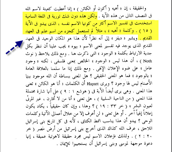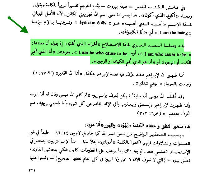 (היה - hâyâh – اهيه ) نرجع للنص الأصلى الذى جاء فى سفر الخروج ....عندما سأل موسى علية الصلاة والسلام الله عز وجل عن أسمة .... سفر الخروج 3: 13 فقال موسى لله ها انا اتي الى بني اسرائيل و اقول لهم اله ابائكم ارسلني اليكم فاذا قالوا لي ما اسمه فماذا اقول لهم فماذا قال الله لة ؟؟؟............ (HOT) ויאמר אלהים אל־משׁה אהיה אשׁר אהיה ויאמר כה תאמר לבני ישׂראל אהיה שׁלחני אליכם׃ (LXX) καὶ εἶπεν ὁ θεὸς πρὸς Μωυσῆν Ἐγώ εἰμι ὁ ὤν· καὶ εἶπεν Οὕτως ἐρεῖς τοῖς υἱοῖς Ισραηλ Ὁ ὢν ἀπέσταλκέν με πρὸς ὑμᾶς. (KJV) And God said unto Moses, I AM THAT I AM: and he said, Thus shalt thou say unto the children of Israel, I AM hath sent me unto you 3: 14 فقال الله لموسى اهيه الذي اهيه و قال هكذا تقول لبني اسرائيل اهيه ارسلني اليكم (אהיה אשׁר אהיה - Ἐγώ εἰμι ὁ ὤν - I AM THAT I AM - اهيه الذي اهيه ) ما معنى هذة العبارة ؟؟؟؟......... لناخذ أولا معنى اهية .... نذهب الى قاموس bdb היה hâyâh BDB Definition: 1) to be, become, come to pass, exist, happen, fall out ونذهب الى قاموس strong היה hâyâh haw-yaw' A primitive root (compare H1933); to exist, that is, be or become, come to pass اذا فالكلمة تعنى يكون أو يصبح أو يحدث ..... واهيه حتى يعلم الجميع ليست خاصة بالله فقط فى العهد القديم .....وقد قالها الكثير فى العهد القديم ......نأخذ مثلا على سبيل المثال Jdg 11:9 (HOT) ויאמר יפתח אל־זקני גלעד אם־משׁיבים אתם אותי להלחם בבני עמון ונתן יהוה אותם לפני אנכי אהיה לכם לראשׁ׃ (KJV) And Jephthah said unto the elders of Gilead, If ye bring me home again to fight against the children of Ammon, and the LORD deliver them before me, shall I be your head? 11: 9 فقال يفتاح لشيوخ جلعاد اذا ارجعتموني لمحاربة بني عمون و دفعهم الرب امامي فانا اكون لكم راسا مثال اخر 1Sa 18:18 (HOT) ויאמר דוד אל־שׁאול מי אנכי ומי חיי משׁפחת אבי בישׂראל כי־אהיה חתן למלך׃ (KJV) And David said unto Saul, Who am I? and what is my life, or my father's family in Israel, that I should be son in law to the king? 18: 18 فقال داود لشاول من انا و ما هي حياتي و عشيرة ابي في اسرائيل حتى اكون صهر الملك مثال أخير ... صموئيل الثانى 15: 34 و لكن اذا رجعت الى المدينة و قلت لابشالوم انا اكون عبدك ايها الملك انا عبد ابيك منذ زمان و الان انا عبدك فانك تبطل لي مشورة اخيتوفل (HOT) ואם־העיר תשׁוב ואמרת לאבשׁלום עבדך אני המלך אהיה עבד אביך ואני מאז ועתה ואני עבדך והפרתה לי את עצת אחיתפל׃ (KJV) But if thou return to the city, and say unto Absalom, I will be thy servant, O king; as I have been thy father's servant hitherto, so will I now also be thy servant: then mayest thou for me defeat the counsel of Ahithophel. والان علمنا ان كلمة اهيه ليست لها اى قدسية فى العهد القديم ويمكن ان يقولها اى شخص هذا أولا .... نعود الى عبارة اهية الذى اهيه ونرى كيف اختلف المفسرون حول معناها وترجماتها .... وقبل ان نذهب الى المفسرون نذهب الى kjc لنعرف ما معنى اهية تحديدا فى نص سفر الخروج 3 -14 ... KJC am, Exo_3:14 (4), Psa_88:3-4 (2), Psa_102:6 (2) اذا فكلمة اهيه اتت بمعنى يكون فى نص سفر الخروج وبتالى تصبح الترجمة الحرفية لعبارة اهية اشير اهيه بالعبرية ... هى أكون الذى أكون بالعربية .... لنذهب الى تفسير ادم كلارك لنرى ان هذة العبارة يمكن فهمها بأشكال كثيرة ... These words have been variously understood. The Vulgate translates Ego Sum Qui Sum, I am who am. The Septuagint, Εγω ειμι ὁ Ων, I am he who exists. The Syriac, the Persic, and the Chaldee preserve the original words without any gloss. The Arabic paraphrases them, والان نرى بعض ترجمات هذة العبارة .... ينقل الينا الاب متى المسكين تفسير اليهود لهذة العبارة ويقول ان معناها انا الذى أقيم الكيان أو الوجود ونقرأ فى كتاب دليل الى قراءة الكتاب المقدس وبعد ان صرح ان هذة العبارة من الصعب ترجمتها قال ان العبارة تعنى انا من أكون ... اى سيعرفنى الناس مع مرور الوقت ... http://www.ebnmaryam.com/vb/attachme...1&d=1279829279 ونقرأ فى القاموس الموسوعى للعهد الجديد ... ان الكلمة معناها انا الكائن الواحد ... http://www.ebnmaryam.com/vb/attachme...1&d=1279313834 http://www.ebnmaryam.com/vb/attachme...1&d=1279313834 وننقل من القمص بسيط بعض الترجمات الاخرى "أكون الذى أكون"..................I Am Who I Am "أكون ما أكون"....................I Am What I Am "أكون الذى أكون".....................I Am That I A "أكون الذى أكونه"......I Am That is Who I am "سأكون ما أكون…I Will Be What I W