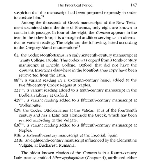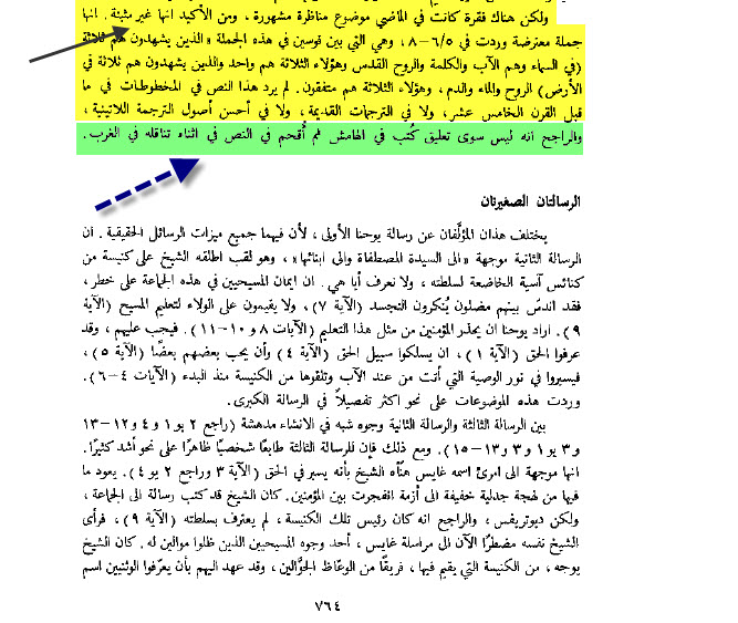 تعالى ناخد القصة من أكبر علماء النقد النصى بروس متزجر وبارت ارمان (3) كان هناك انتقاد موجة الى ارازموس ( صاحب اول طبعة للعهد الجديد ) ...ان نصة لا يوجد بة نص الثالوث (الأب ، الكلمة و الروح القدس و هؤلاء الثلاثة واحد) ... ورد عليهم ارازموس ان هذا النص لم يجده فى اى مخطوطة يونانية .... ودرس ارازموس خلال هذا الوقت مخطوطات اخرى بجانب الذى اعتمد عليهم فى تحضير نصة .... ومن المحتمل ان ارازموس وعدهم انة سيدخل نص الثالوث فى الطبعة المستقبلية ... لو وجد هذا النص فى اى مخطوطة يونانية ..... ومن المحتمل انة تم كتابة المخطوطة اليونانية ( التى تحتوى على نص الثالوث ) فى أوكسفورد سنة 1520 بواسطة راهب يُسمى فروى او روى ... ثم ذكر المخطوطات اليونانية .. التى تحتوى على هذا النص والتى يعود أقدمها الى القرن الرابع عشر تقريبا ...!! ثم قال فى صفحة 148 يعترف العلماء ان هذة الكلمات ليست ضمن العهد اليونانى ... http://www.ebnmaryam.com/vb/attachme...6&d=1287877779 http://www.ebnmaryam.com/vb/attachme...8&d=1287877779 http://www.ebnmaryam.com/vb/attachme...9&d=1287877998 http://www.ebnmaryam.com/vb/attachme...7&d=1287877779 ويقول بارت ايرمان ....(4) بعد ان اعترف ان هذا النص هو النص الوحيد الذى يشير بوضوح الى عقيدة الثالوث ان ارازموس لم يجد هذا النص فى مخطوطاتة اليونانية ... والتى تقرأ هناك ثلاثة يشهدون الروح الماء والدم وهؤلاء الثلاثة هم واحد أين الاب والابن والروح القُدس ؟؟؟؟ .... لا يوجد ذكر لهم فى مخطوطة ايرازموس وهذا اثار غضب اللاهوتيين منة .... وقد اتهموه بمحاولة الخلاص من عقيدة التثليث ..!! ويقول ايضا .... مع مضى القصة وافق ارازموس ربما فى لحظة ضعف .!!! .... ان يضع هذا العدد فى الطبعة المستقبلية .... ولكن بشرط واحد ...ان يقدم لة خصومة مخطوطة يونانية واحدة يوجد بها هذا العدد .....وظهرت مخطوطة يونانية الى الوجود بهذة المناسبة ..!! .....ويبدو ان شخص قام بترجمة قام بترجمة النص اللاتيني إلى اليونانية وظهرت الفاصلة اليونانية فى شكلها المألوف http://www.ebnmaryam.com/vb/attachme...1&d=1287877998 http://www.ebnmaryam.com/vb/attachme...1&d=1273369331 اما رتشرد سولين (5) فقال بكل بساطة .. ان الفاصلة اليوحانوية دخلت عن طريق الخطأ .. الى ترجمة اللاتينية ... وقد حذفها ارزموس فى البداية .. ثم عاد وارعجها بعد احتجاج ...!!! http://www.ebnmaryam.com/vb/attachme...1&d=1287878124 http://www.ebnmaryam.com/vb/attachme...3&d=1287878124 اما كولن .. (6) فبعد أن أكد الكلام السابق .. قال ان الفاصلة اليوحانوية تم حذفها من كل النسخ اليونانية الحديثة للعهد الجديد .... اما دائرة المعارف الكتابية (7) فقد اعترفت بكل سهولة .. ان هذة الأضافة تم اضافتها لتدعيم فكر لاهوتى ...!!! ( ولا تعليق طبعا ) وهذا بالطبع ليس بغريب .. فنحن نعلم أنة كان يتم التبديل فى نصوص العهد الجديد .. لأسباب لاهوتية ... فكان الناسخ يريد ان تقول النصوص ما يقولة .... واحيانا كان هذا بسبب الخلافات اللاهوتية ...!!! (8) http://www.ebnmaryam.com/vb/attachme...6&d=1287081299 http://www.ebnmaryam.com/vb/attachme...7&d=1287081299 اما الترجمة اليسوعية .. فكانت أكثر وضوحا .. واعترفت ان النص غير مثبت ... وكان تعليق فى الهامش وتم اقحامة فى النص أثناء تناقلة فى الغرب (9) http://www.ebnmaryam.com/vb/attachme...2&d=1268395431 http://www.ebnmaryam.com/vb/attachme...0&d=1287877243 وتحت عنوان أخطاء النسخ ..!! يقول لنا الدكتور يوسف رياض ...(10) إضافة الحواشي المكتوبة كتعليق على جانب الصفحة كأنها من ضمن المتن: وهو على ما يبدو سبب في إضافة بعض الأجزاء التي لم ترد في أقدم النسخ وأدقها مثل عبارة "السالكين ليس حسب الجسد بل حسب الروح" في رومية 8: 1، وأيضاً عبارة "الذين يشهدون في السماء هم ثلاثة..." الواردة في 1يوحنا 5: 7. اما وليم كيلى فكان صريح جدا وقال (11) على أن الفصل الذي أمامنا قد زيدت عليه بعض الكلمات سواء بقصد أو بغير قصد وهي التي تراها في الكتاب المشوهد بين قوسين، وكما وضعنا نحن في رأس هذا الموضوع فمن المسلم به تحقيقاً أن الفقرة المبتدئة بكلمتي « في السماء » في العدد السابع والمنتهية بكلمتي « على الأرض » في العدد الثامن ليست جزءاً من النص الأصلي فربما كانت في مبدأ الأمر هامشاً على إحدى النسخ فجاء أحد النساخ وأدخلها في المتن ظاناً أنها منه. وقد تناول