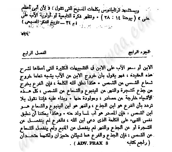 المسيحى ...لا يعدد الهة فى تفكيرة .. لانة يؤمن ان الاب ولابن والروح القدس واحد ولكن وفقا لنظرية التبعية التي كان بييؤمن بيها عظماء رجال الكنيسة ... قبل مجمع نيقية النظرية بكل بساطة بتقول ... ان الاب هو الاعظم ... ثم يأتى بعدة الابن .. ثم يأتى بعدة الروح القدس يعنى الاب درجة أولى ... والابن درجة تانية ... والروح القدس رجة ثالثة وبكدة مبقوش الة واحد ... بل ثلاثة الهة ... نأخد مثلا على سبيل المثال اوريجانوس علم الباترولوجى - تادرس يعقوب ملطى http://www.kalemasawaa.com/vb/attach...1&d=1366834865 http://www.kalemasawaa.com/vb/attach...1&d=1286450740 ناخد كمان جاستين الشهيد http://www.kalemasawaa.com/vb/attach...1&d=1366834865 ترجمة مبسطة اننا نعبد المسيح بعد ان علمنا انه ابن الله ونضعه في المرتبة الثانية يعد الاب كما اننا نضع الروح القدس في المرتبة الثالثة ثاوفيلس الانطاكى http://www.kalemasawaa.com/vb/attach...9&d=1366846025 ونفس الكلام بالنسبة لهيبولتس (1) .... وترتليانوس (2) http://www.kalemasawaa.com/vb/attach...1&d=1366912931 http://www.kalemasawaa.com/vb/attach...5&d=1366912931 أو لو اعتبرنا أن التوحيد فى المسيحية قائم على مساواه الثلاثة أقانيم فهذا المفهوم ... مفهوم مصنوع فى مجمع نيقية ....وغير موجود فى كتابات الاباء قبل نيقية http://www.kalemasawaa.com/vb/attach...1&d=1366834865 http://www.kalemasawaa.com/vb/attach...1&d=1366834865 ترجمة مبسطة مبدأ مساواة الاب والابن والروح القدس لا يوجد فى اى عمل فى الثلاثة القرون الاولى وبكدة ينتهى الموضوع 1- تاريخ الفكر المسيحى -جزء واحد - صفحة 581 و582 2- نفس المرجع صفحة 529 |