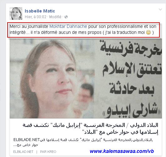 تعليقا على ماجاء في الصحيفة تقول المهتدية " إيزابيل ماتيك " عبر صفحتها على الفيس بوك :