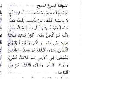 لقد وضعت الجملة( فى السماء الاب والكلمة والروح القدس وهؤلاء الثلاثة هم واحد) بين قوسين كما هو واضح فى الصورة . وما يوضع بين القوسين هو غير موجود بالاصل كما هو مذكور فى اول الكتاب فى تنبيه وهذه صورة من هذا التنبيه
