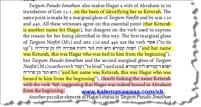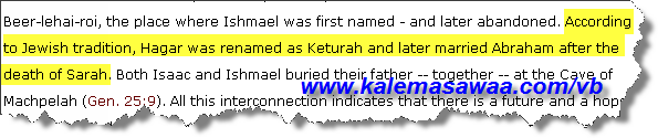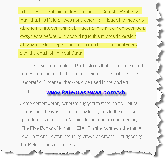 بارك الله فيكَ ونفعَ بكَ و بأبحاثك أخي الحبيب ، نصّ تكوين 25 : 1 - يعتمده اليهود الإسبان الأرثوذوكس - يُفيد بأنّ قطّورة التي اتخذها سيدنا إبراهيم عليه السلام كزوجة هي ذاتها و عينها أمّنا هـــاجر !! ![]() http://shalomhaverim.org/bereshit_en_espanol_cap.25.htm ونقرأ في الهامش :