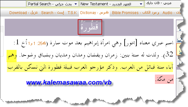 نقرأ على صفحات موقع يهودي ما يلي : ![]() وفقا للتقليد اليهودي هاجر تمت تسميتها بـــ قطّورة عندما تزوجت بإبراهيم عقب وفاة سارة http://www.hebrew4christians.com/Art...and_sarah.html بخصوص قطّورة ( هاجر ) يتحفنا قاموس كتاب النّصارى المقدس بما هو آت : ![]()