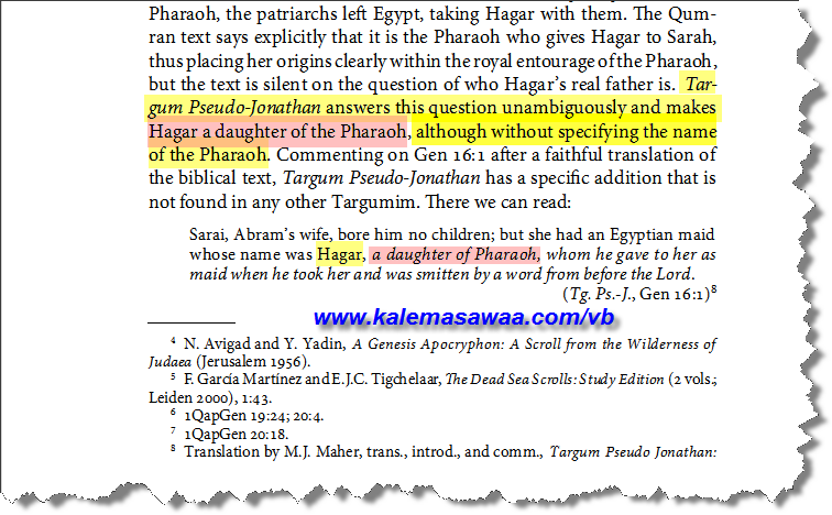 ![]() نصوص قمران تفيد بأنّ فرعون هو من منح هاجر لسارة وهذا مايجعلها ضمن المحيط الملكي . هذه النصوص لم تفصح عن الهوية الحقيقية لوالد هاجر لكن ترجوم جوناثان أجاب عن السؤال و جعل منها إبنة فرعون بدون تحديد إسم هذا الأخير !!!!! http://www.academia.edu/662146/Hagar...seudo-Jonathan ![]() ![]()