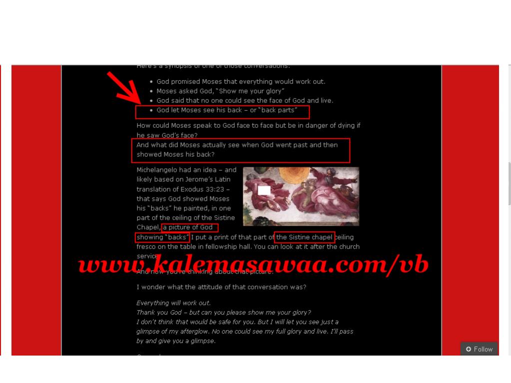 لنر ماذا تقول الترجمة الانجليزية KJV : 23. And I will take away mine hand, and thou shalt see my back parts: but my face shall not be seen. حادثة تعرّي ( الربّ ) هذه صوّرها النحَات و الرسام مايكل انجلو في احدى الجداريات ... و المفاجأة الكبرى .... هذه الجدارية توجد باحدى الكنائس وتُدعى كنيسة سيستين ، في قلب .......... . . . . . . . . . . . . . . . . . الفاتيكان ![]() http://en.wikipedia.org/wiki/Sistine_Chapel للمزيد من مواضيعي