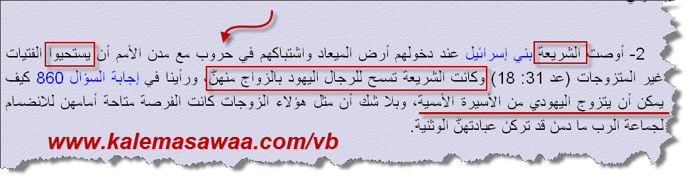 ![]() في نفس السّياق نقرأ من تثنية21 : 10- إِذَا خَرَجْتَ لِمُحَارَبَةِ أَعْدَائِكَ وَدَفَعَهُمُ الرَّبُّ إِلهُكَ إِلَى يَدِكَ، وَسَبَيْتَ مِنْهُمْ سَبْيًا . 11- وَرَأَيْتَ فِي السَّبْيِ امْرَأَةً جَمِيلَةَ الصُّورَةِ، وَالْتَصَقْتَ بِهَا وَاتَّخَذْتَهَا لَكَ زَوْجَةً. 12- فَحِينَ تُدْخِلُهَا إِلَى بَيْتِكَ تَحْلِقُ رَأْسَهَا وَتُقَلِّمُ أَظْفَارَهَا . 13 - وَتَنْزِعُ ثِيَابَ سَبْيِهَا عَنْهَا، وَتَقْعُدُ فِي بَيْتِكَ وَتَبْكِي أَبَاهَا وَأُمَّهَا شَهْرًا مِنَ الزَّمَانِ، ثُمَّ بَعْدَ ذلِكَ تَدْخُلُ عَلَيْهَا وَتَتَزَوَّجُ بِهَا، فَتَكُونُ لَكَ زَوْجَةً. 14- وَإِنْ لَمْ تُسَرَّ بِهَا فَأَطْلِقْهَا لِنَفْسِهَا. لاَ تَبِعْهَا بَيْعًا بِفِضَّةٍ، وَلاَ تَسْتَرِقَّهَا مِنْ أَجْلِ أَنَّكَ قَدْ أَذْلَلْتَهَا. ![]() الهولي بايبل يوصي أتباعه بعد أن يقضوا وطرهم من المسبيّات أن يرموهنّ رمية الحذاء القديم ! ![]() للمزيد من مواضيعي