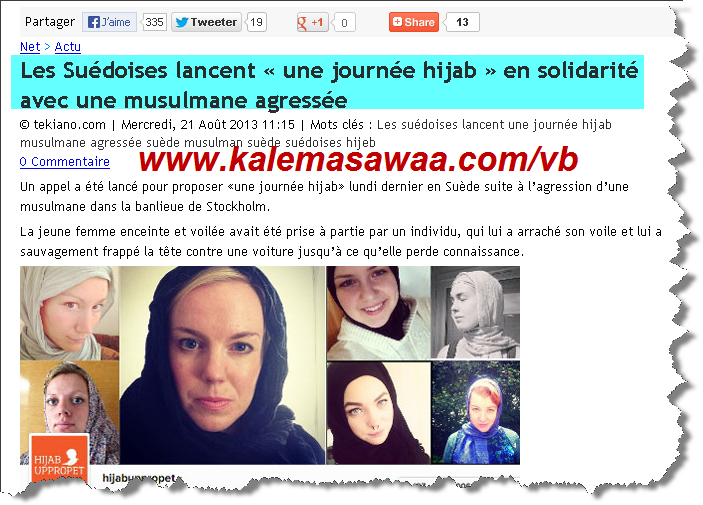 ![]() اللهم صل على محمد وعلى آله وصحبه أجمعين مسلمة محجّبة تتعرض للضرب المبرح من طرف مسيحي متطرّف : ![]() أطلقت مجموعة من السويديات حملة Hijab uppropet ( صرخة الحجاب ) وذلك عقب إعتداء إرهابي آثم تعرضت له مسلمة محجبة على يد مسيحي سويدي متطرف بضواحي مدينة ستوكهولم . المتطرف المسيحي نزع حجاب المسلمة و ضرب رأسها بكل وحشية على إحدى السيارات دون إعتبار كونها فتاة بالإضافة إلى كونها تحمل جنينا في بطنها . السويديات لجأن إلى إرتداء الحجاب كتعبير منهن على تعاطفهن مع المسلمة التي فقدت وعيها نتيجة للإعتداء الإرهابي . للمزيد من مواضيعي