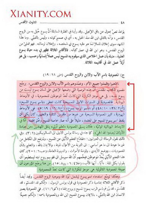 و يحلو للنصارى أن يستشهدوا بنهاية إنجيل متى ليقولوا أن المسيح كان يعلم الناس التثليث فهم يستشهدون بالنص التالى من إنجيل متى إصحاح 28 19 فَاذهَبُوا، وَتَلمِذُوا جَمِيعَ أُمَمِ الأرْضِ، وَعَمِّدوهُمْ بِاسْمِ الآبِ وَالابْنِ وَالرُّوحِ القُدُسِ، و مما لا شك فيه أن النص السابق لا يثبت أن الأب و الابن و الروح القدس هم جميعا الإله الواحد و لا يعقل أن نستنتج من النص السابق أن الله هو الأب و الابن و الروح القدس و نترك تعليم المسيح الصريح القائل أن الأب هو الإله الحقيقى وحده و القائل أن الله هو إلهه و لإنهاء الجدل حول النص السابق نعرض صورة لكتاب ( كنيستى عقيدة و إيمان ) و نرى فى النصوص المصورة تأكيدا على أن أتباع المسيح لم يفهموا من النص السابق التثليث أثناء حياة المسيح و أنهم لم يفهموه إلا بعد رفع المسيح و حلول الروح القدس عليهم لكن لا ننسي أن هناك شكوك حول النص لأن التعميد كان يتم فى الكنيسة الأولى باسم المسيح و ليس باسم الأب و الابن و الروح القدس و قيل أن صيغة التعميد ليست من كلام المسيح و ما سبق ليس كلامى و لكنه نقلا عن : التفسير الحديث للكتاب المقدس كما شهد المطران كيرلس أن صيغة التثليث ليست من كلام المسيح : المزيد من مواضيعي